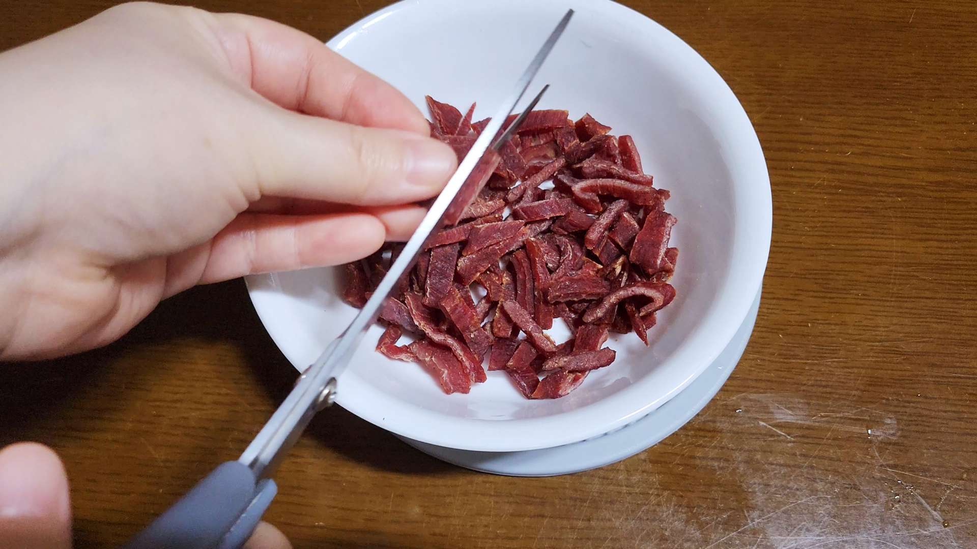 육포는 가위를 이용해 결 반대 방향으로 잘게 채 썰듯이 잘라줍니다.