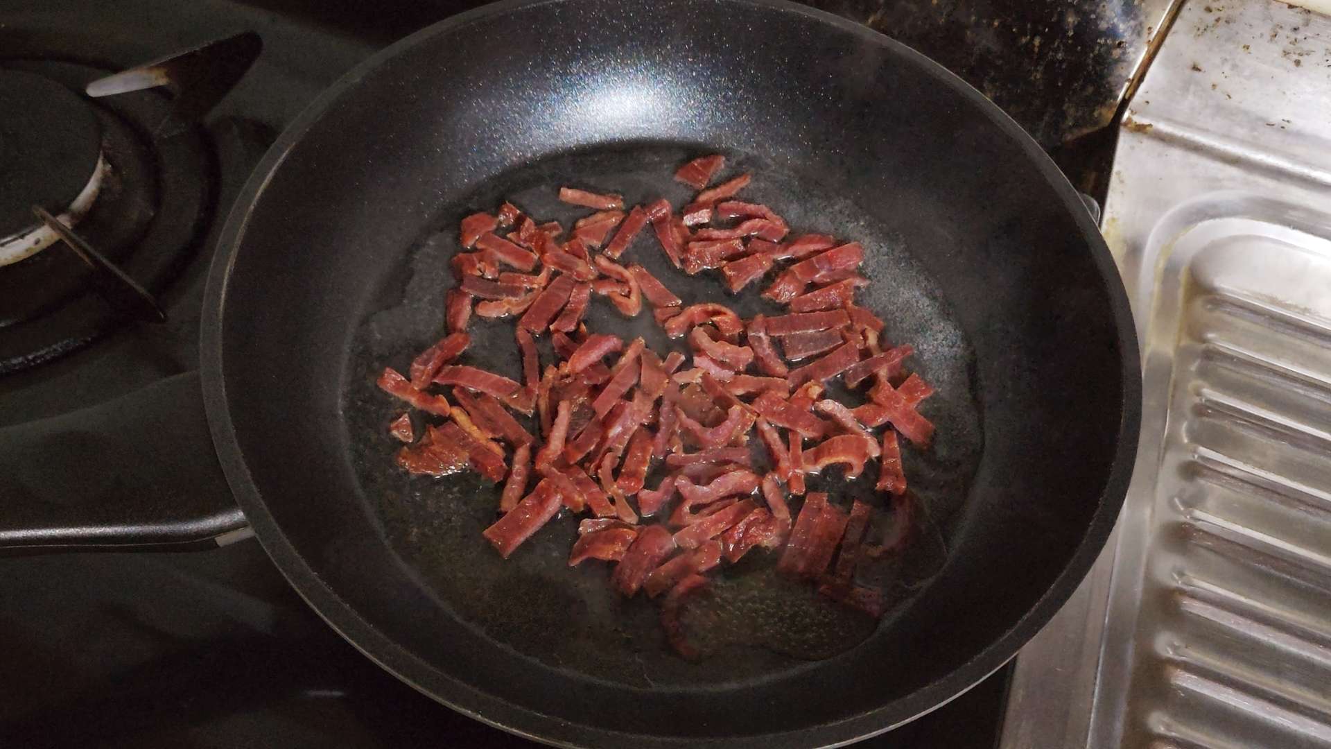 중불로 달군팬에 물 50ml, 육포를 넣고 볶아줍니다.