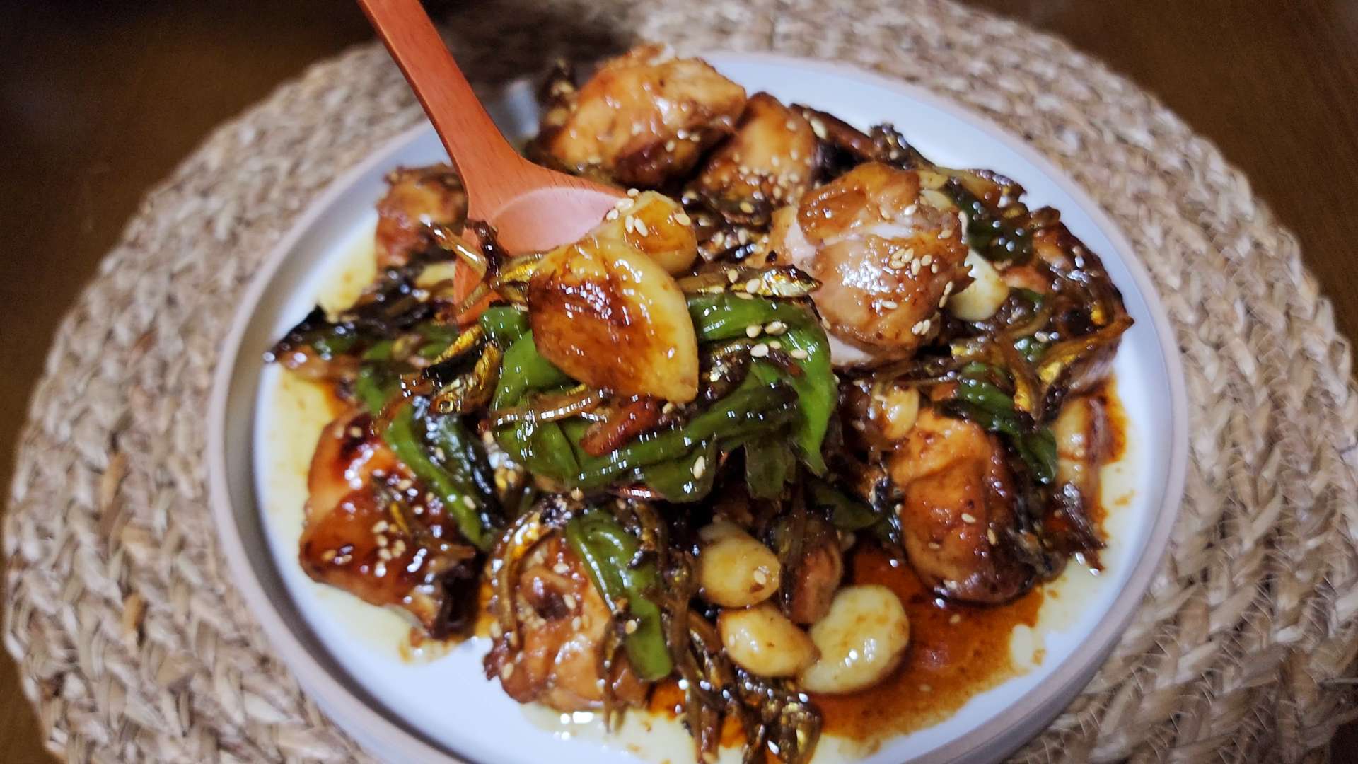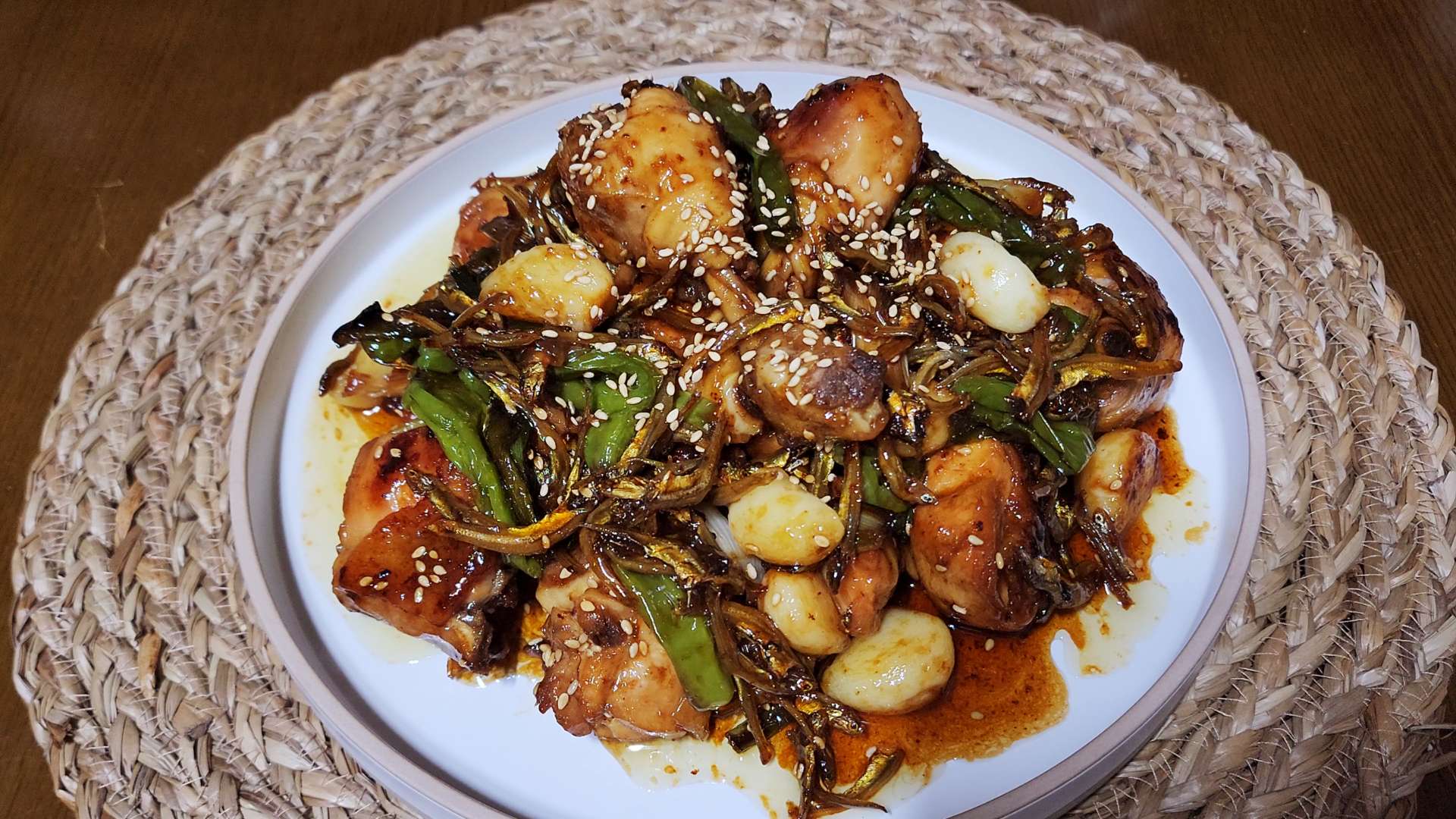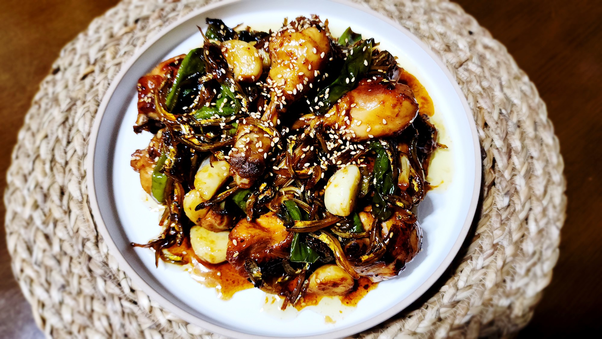달콤짭조름한 꽈리멸치볶음과 구운 치킨을 같이 먹으면 더 맛있답니다.