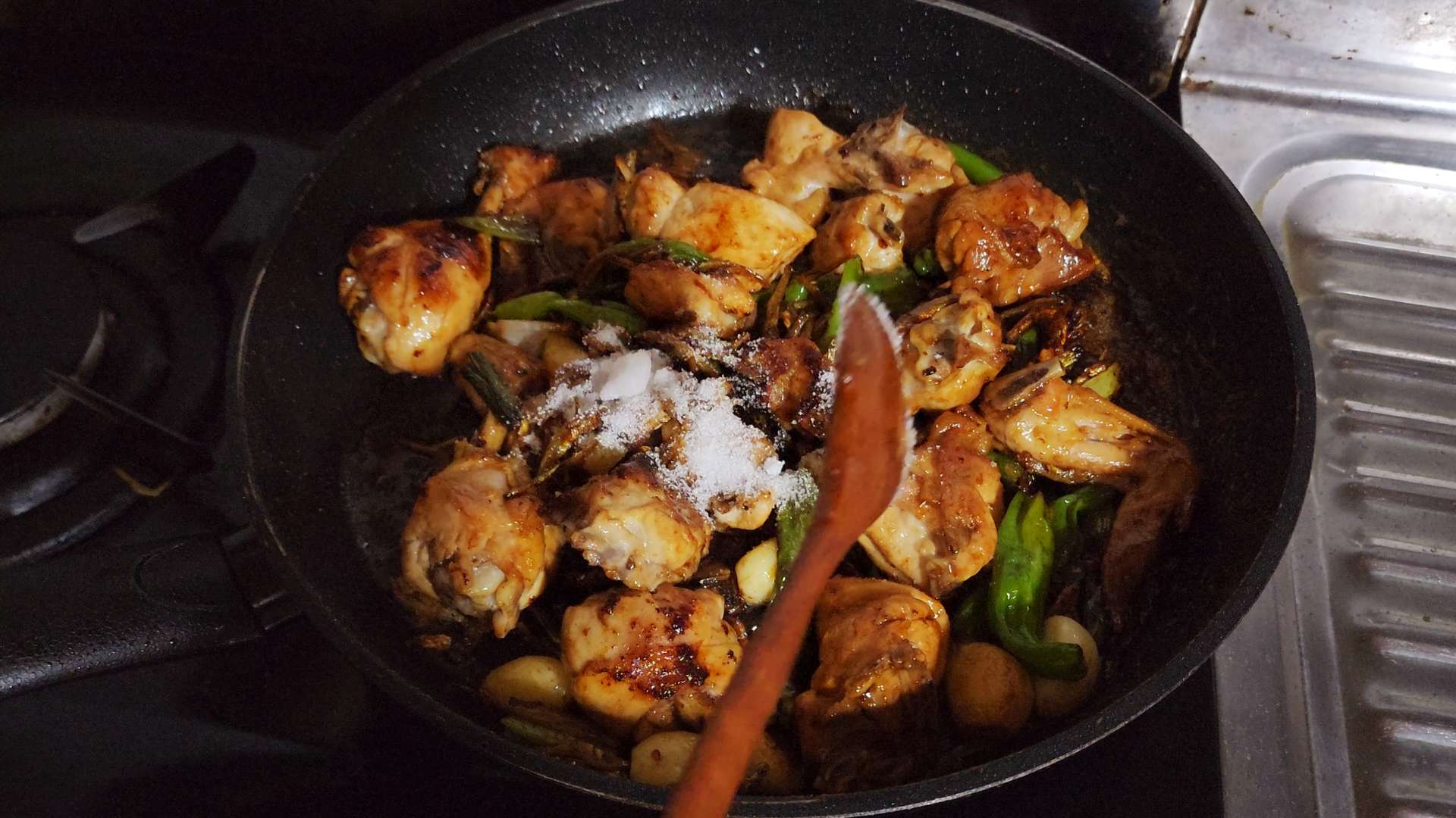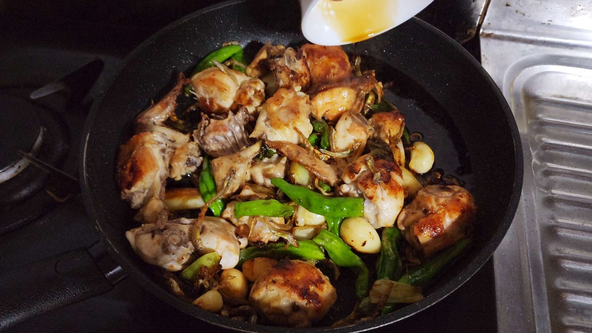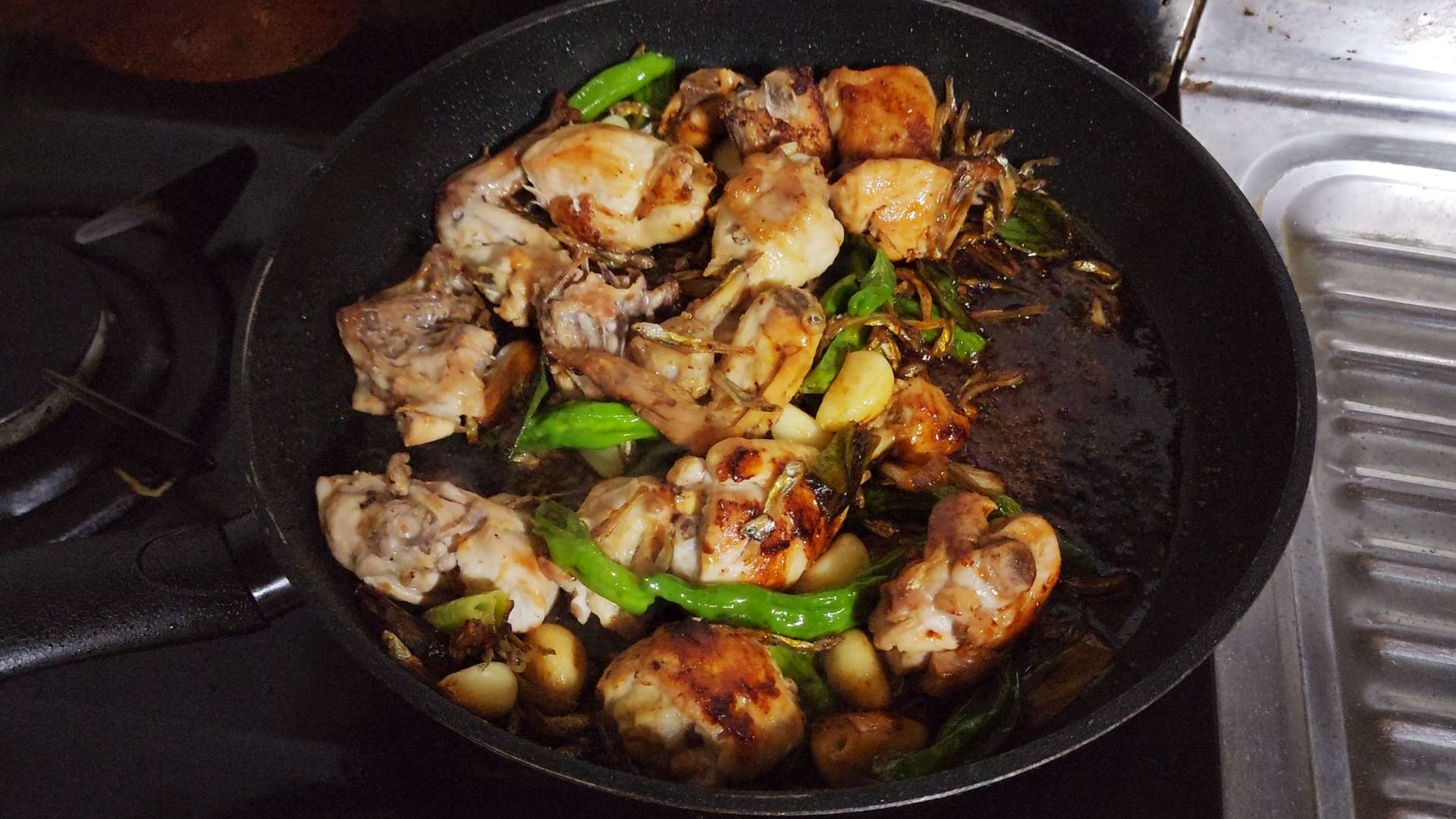 재료: 닭볶음탕용 닭 1kg, 잔멸치 1공기, 꽈리고추 200g, 대파 1대, 통마늘 한 줌, 소금, 멸치액젓 1T, 굴소스 1T, 설탕 1T, 진간장 5T, 물엿 100ml,