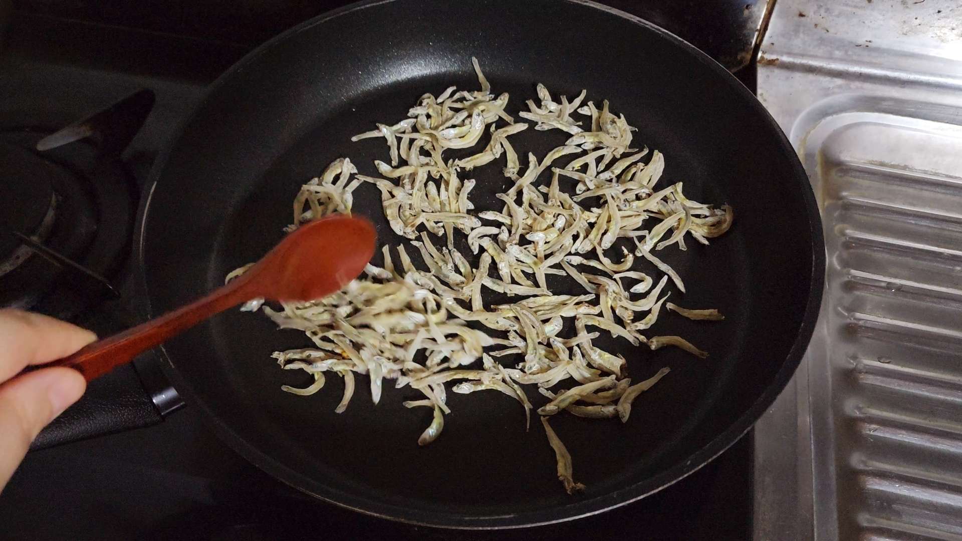 강불로 달군팬에 잔멸치 1공기를 넣고 중불에서 노릇노릇하게 볶아줍니다. 연기가 나기 시작하면 불을 끄고 그릇에 덜어둡니다.