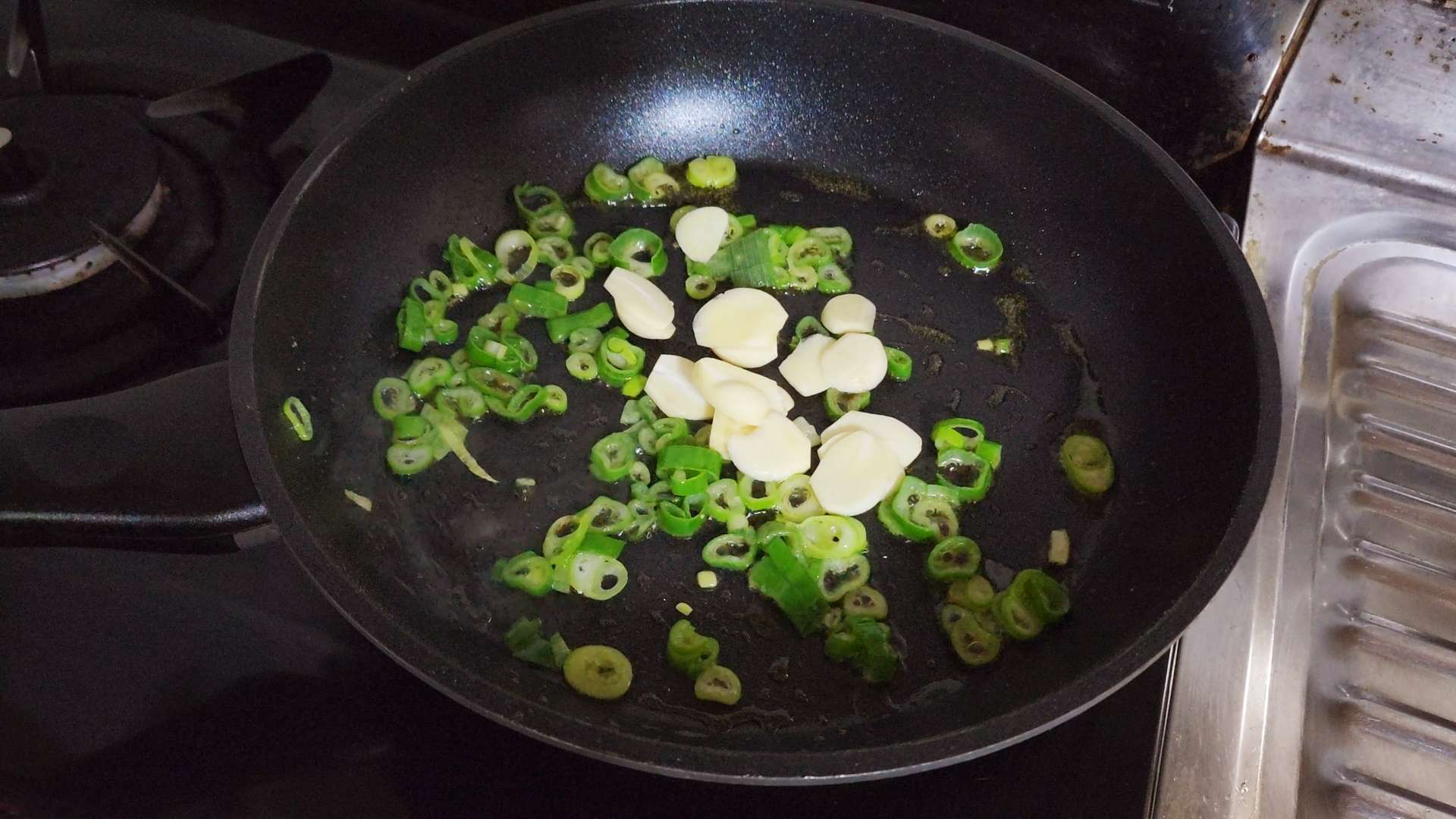 중불로 달군팬에 올리브유, 대파를 넣고 볶아 파기름을 내고 마늘을 넣고 노릇하게 볶아줍니다.