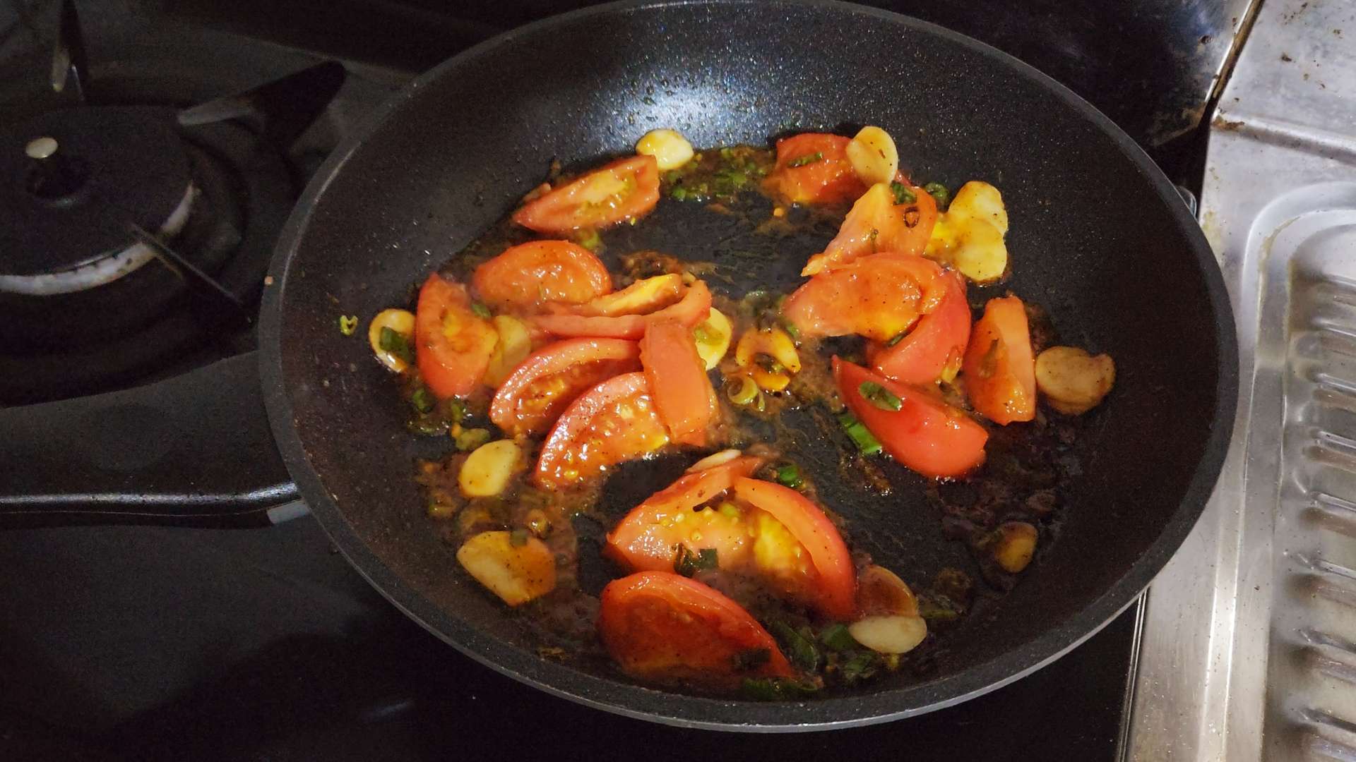 재료: 토마토 2개, 계란 3개, 통마늘 3개, 대파 1/2대, 굴소스 1T, 올리고당 1T, 후추 약간, 올리브 오일 2T, 식용유