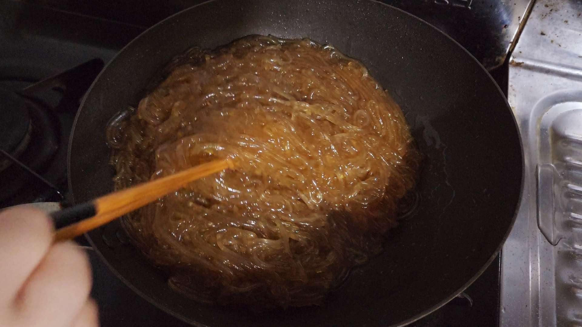 팬에 불린 당면, 진간장 3T, 물, 식용유를 넣고 버무린 뒤 중불에서 3분 볶아줍니다.