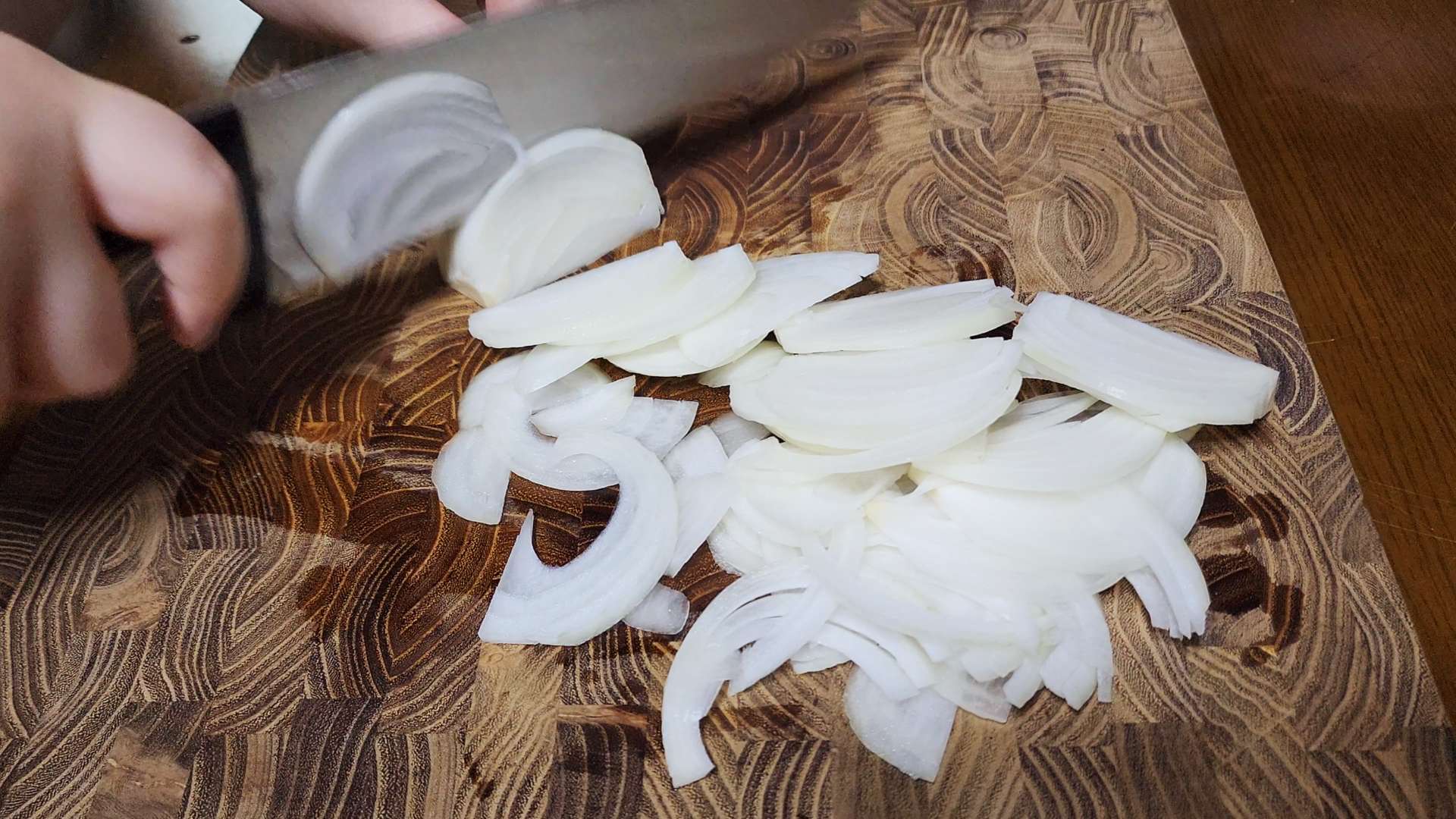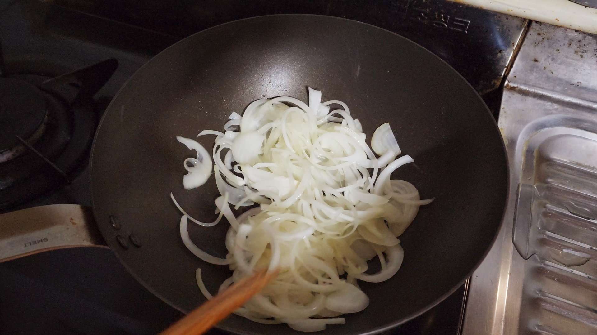 중불로 달군팬에 식용유, 양파, 소금 한꼬집을 넣고 볶아 그릇에 덜어둡니다.