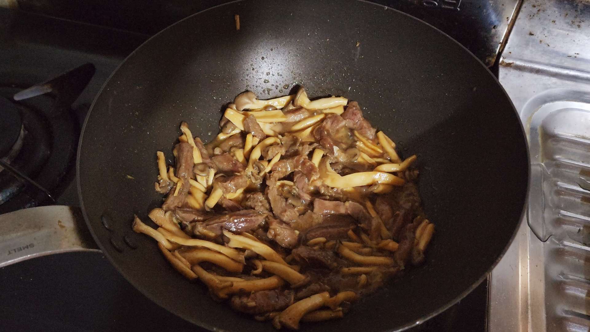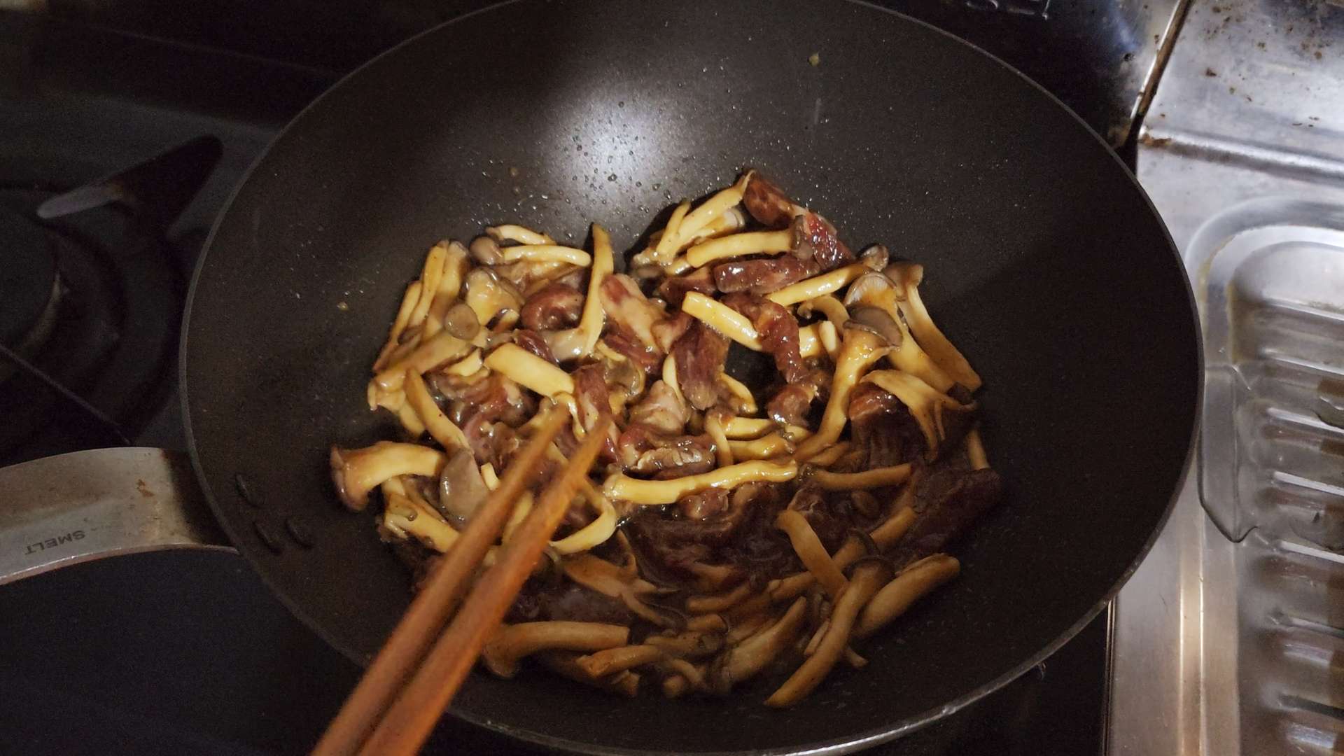 중불로 달군팬에 식용유, 소고기, 버섯을 넣고 센불로 볶아 그릇에 덜어둡니다.
