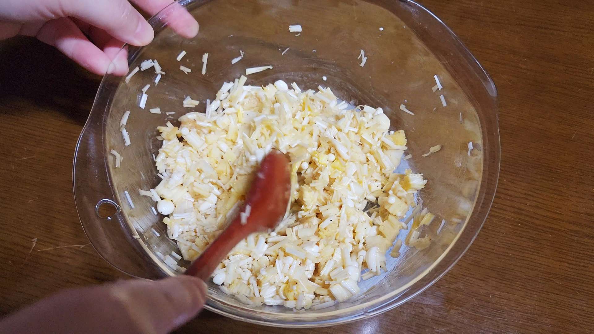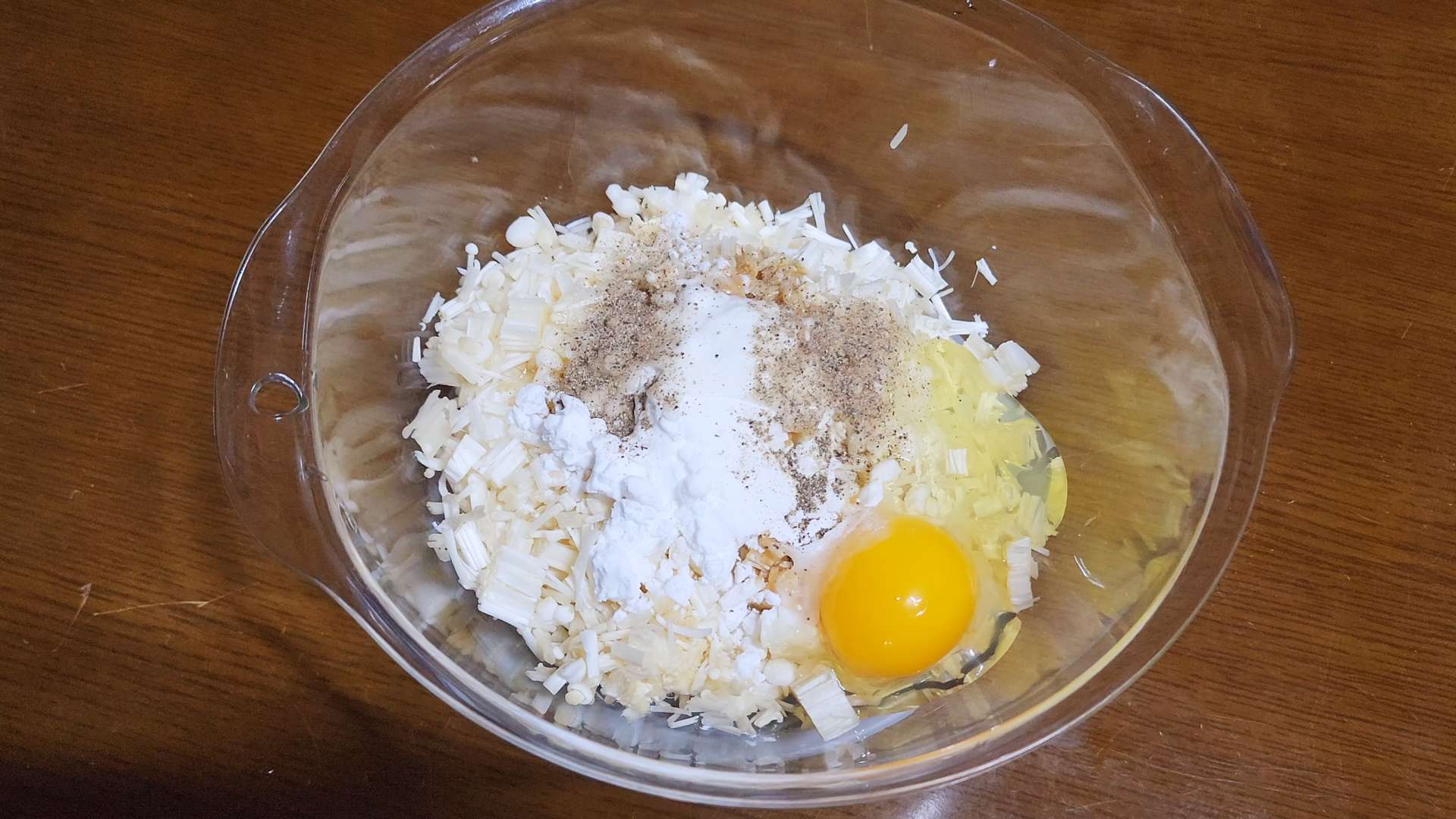 볼에 팽이버섯, 전분 3T, 간장 1t, 달걀 1개, 후추를 넣고 섞어줍니다.
