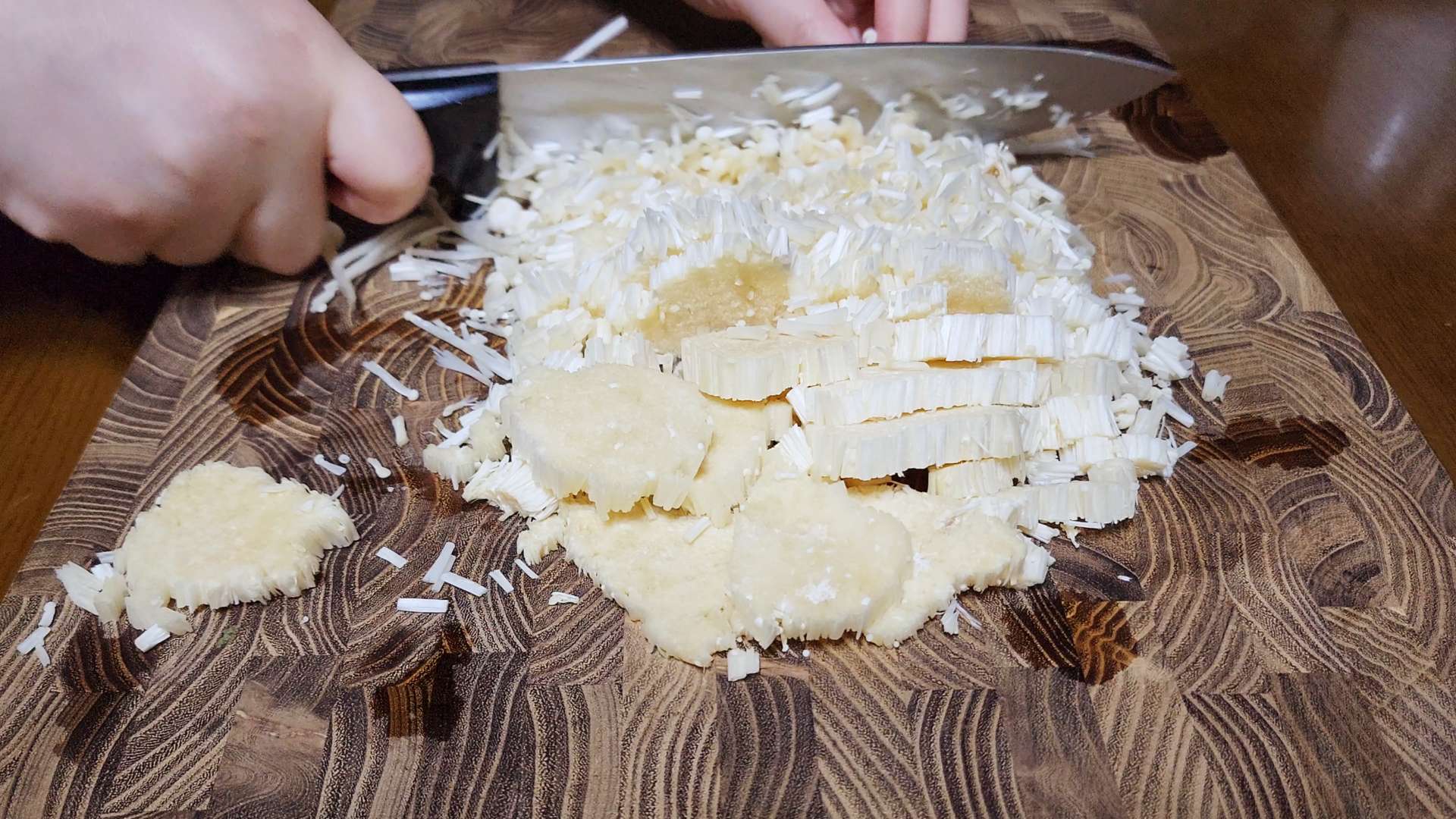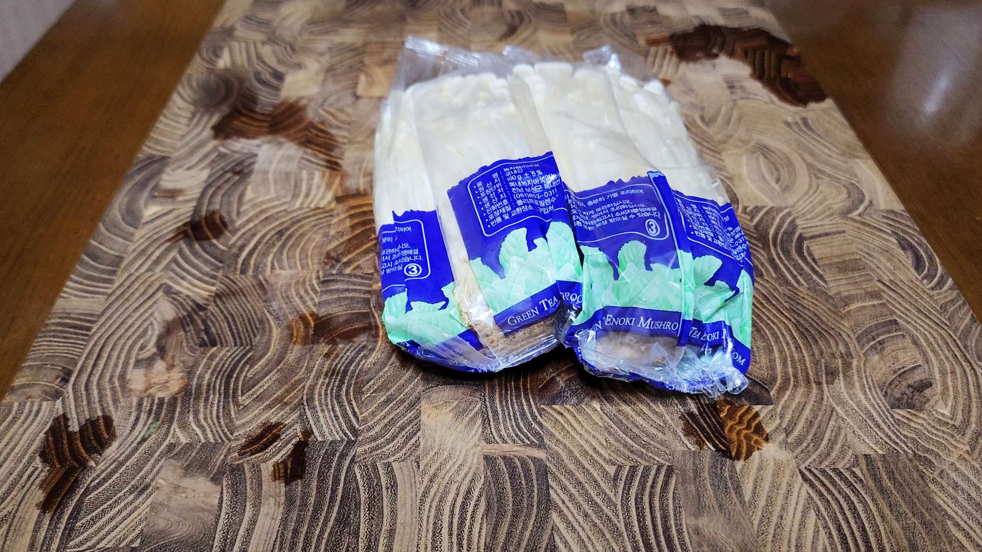 팽이버섯은 밑동을 자르고 잘게 썰어줍니다.