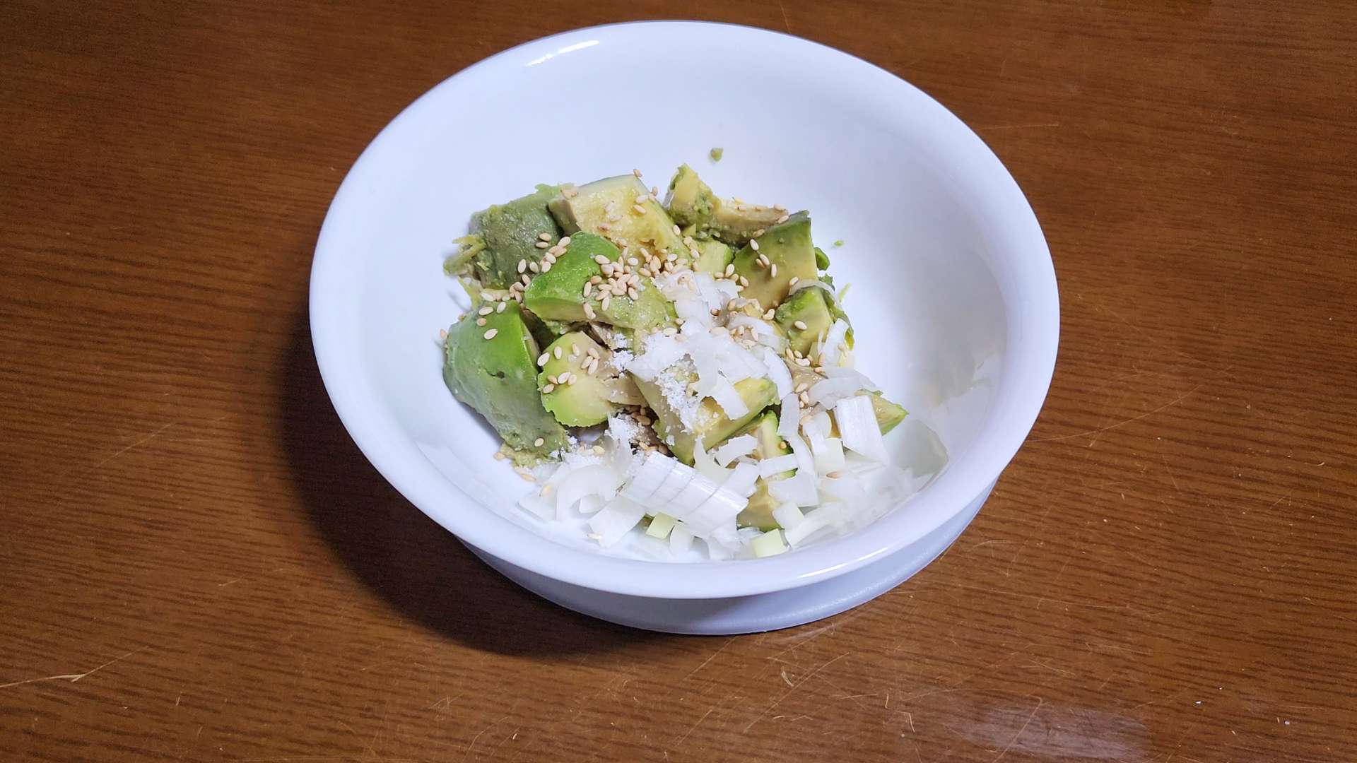 볼에 아보카도, 참기름 1T, 다진 대파 1T, 소금 1/3T, 통깨 1/2T를 넣고 버무려줍니다.