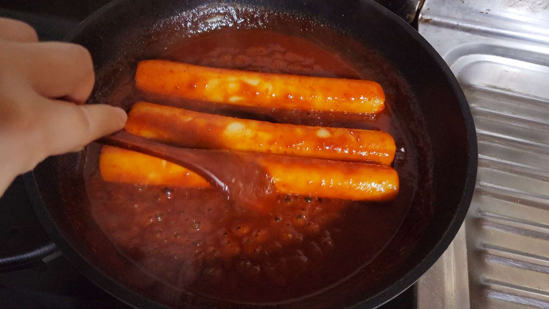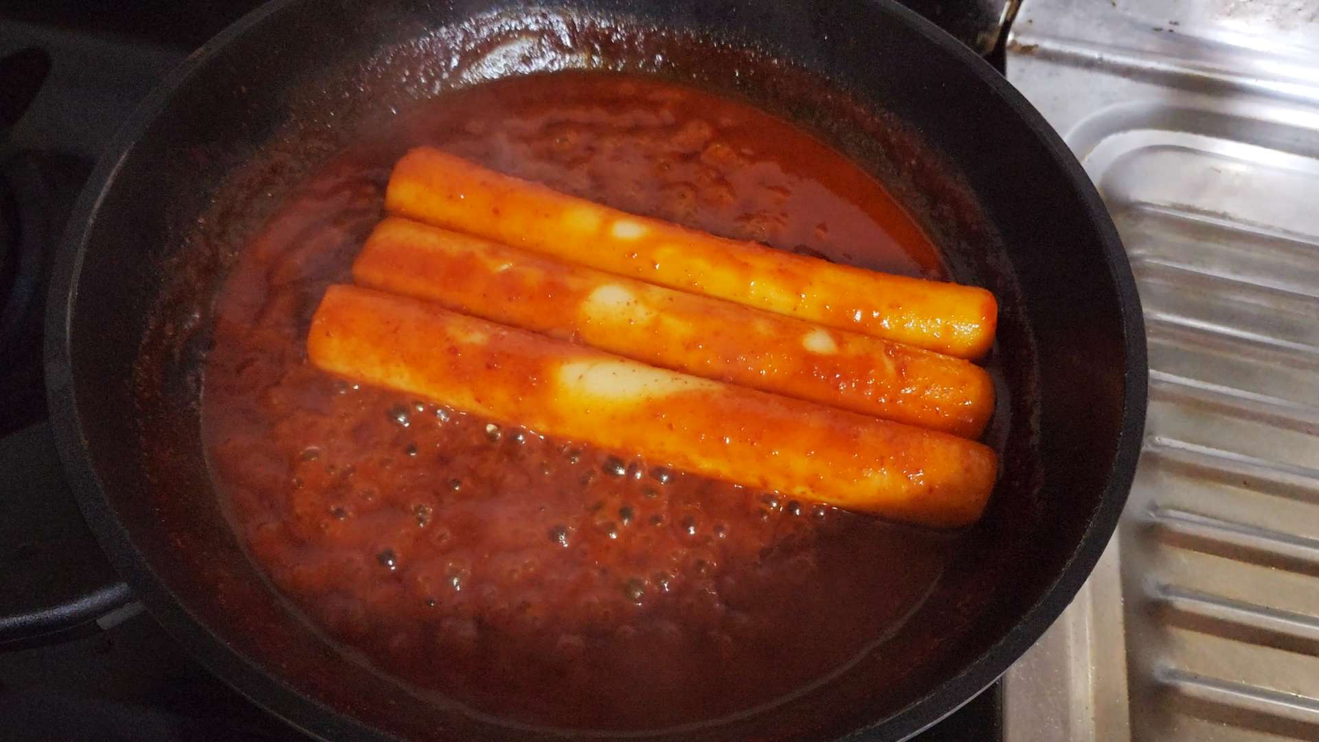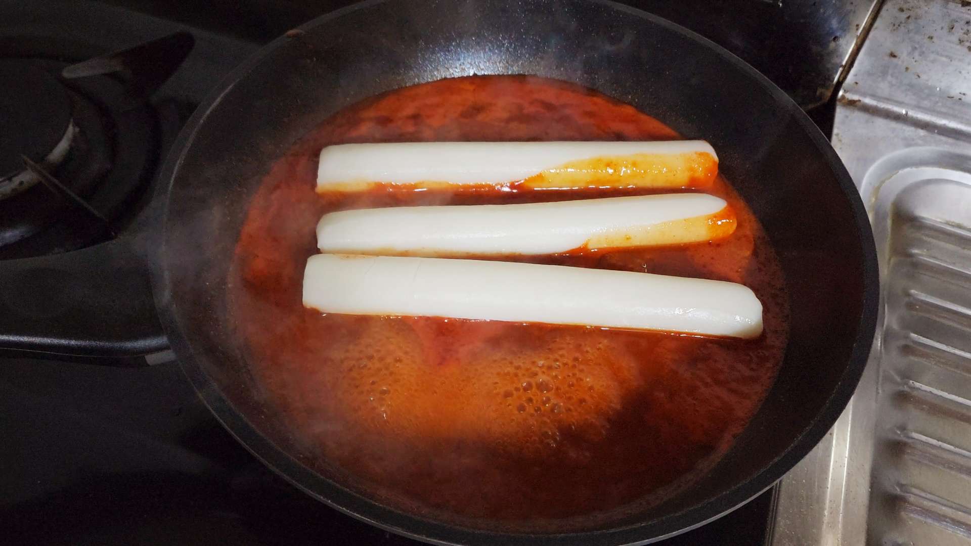 양념이 끓어오르면 중불로 줄이고 가래떡을 넣고