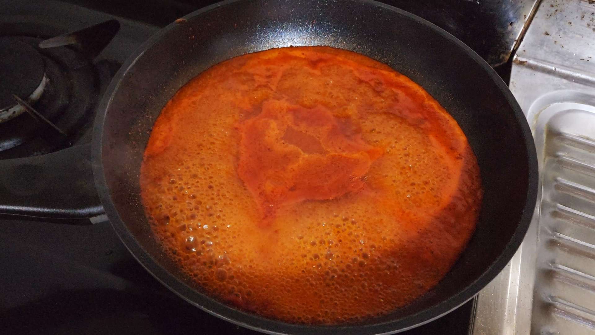 팬에 설탕 1T, 고춧가루 1T, 물엿 4개, 고추장 2와 1/2T, 물 1컵을 넣고 강불에서 끓여줍니다.