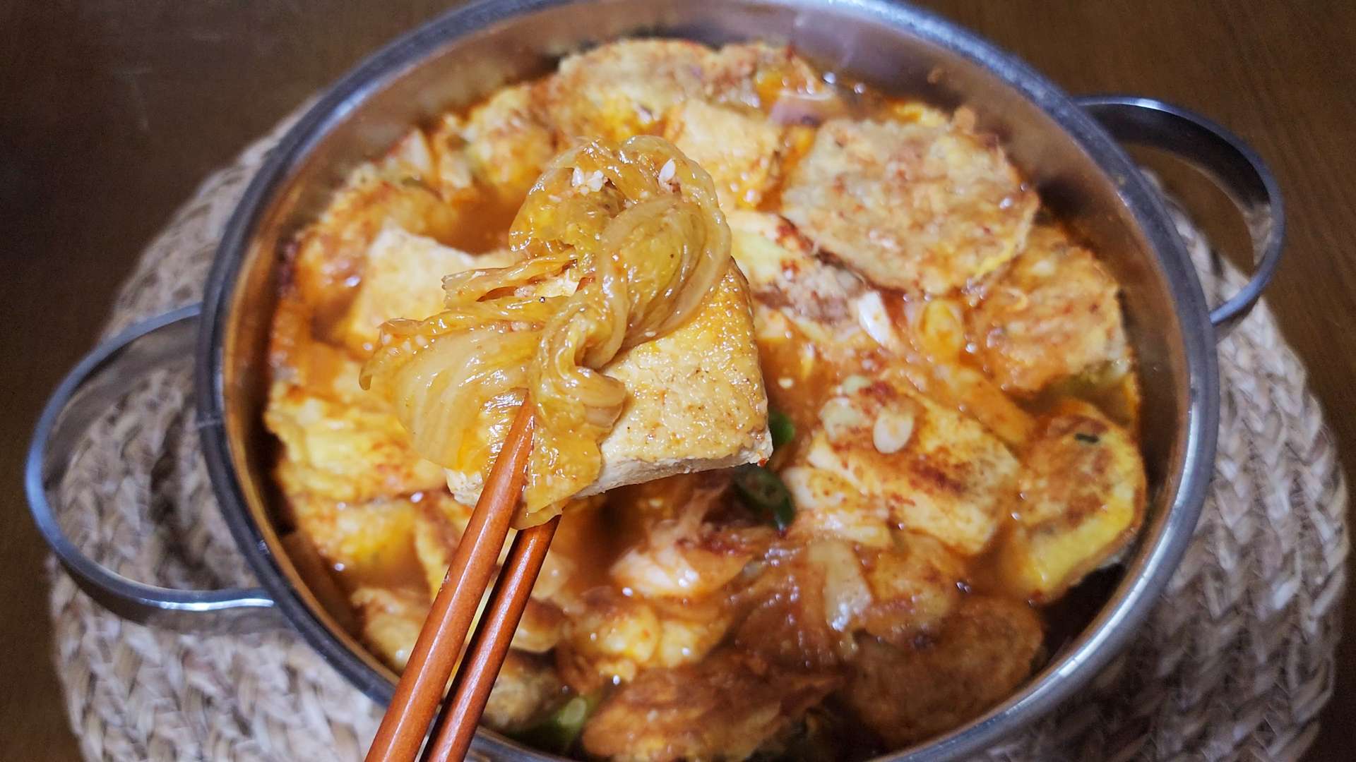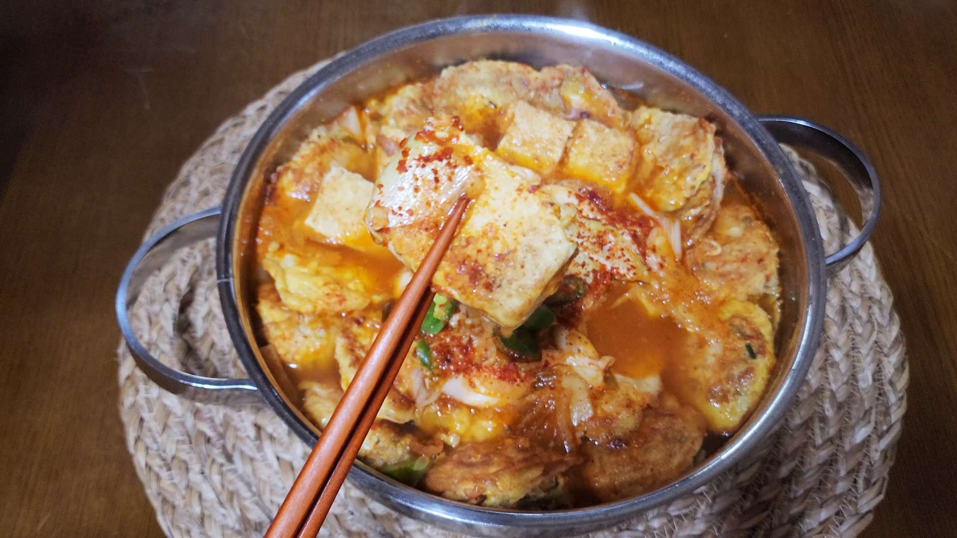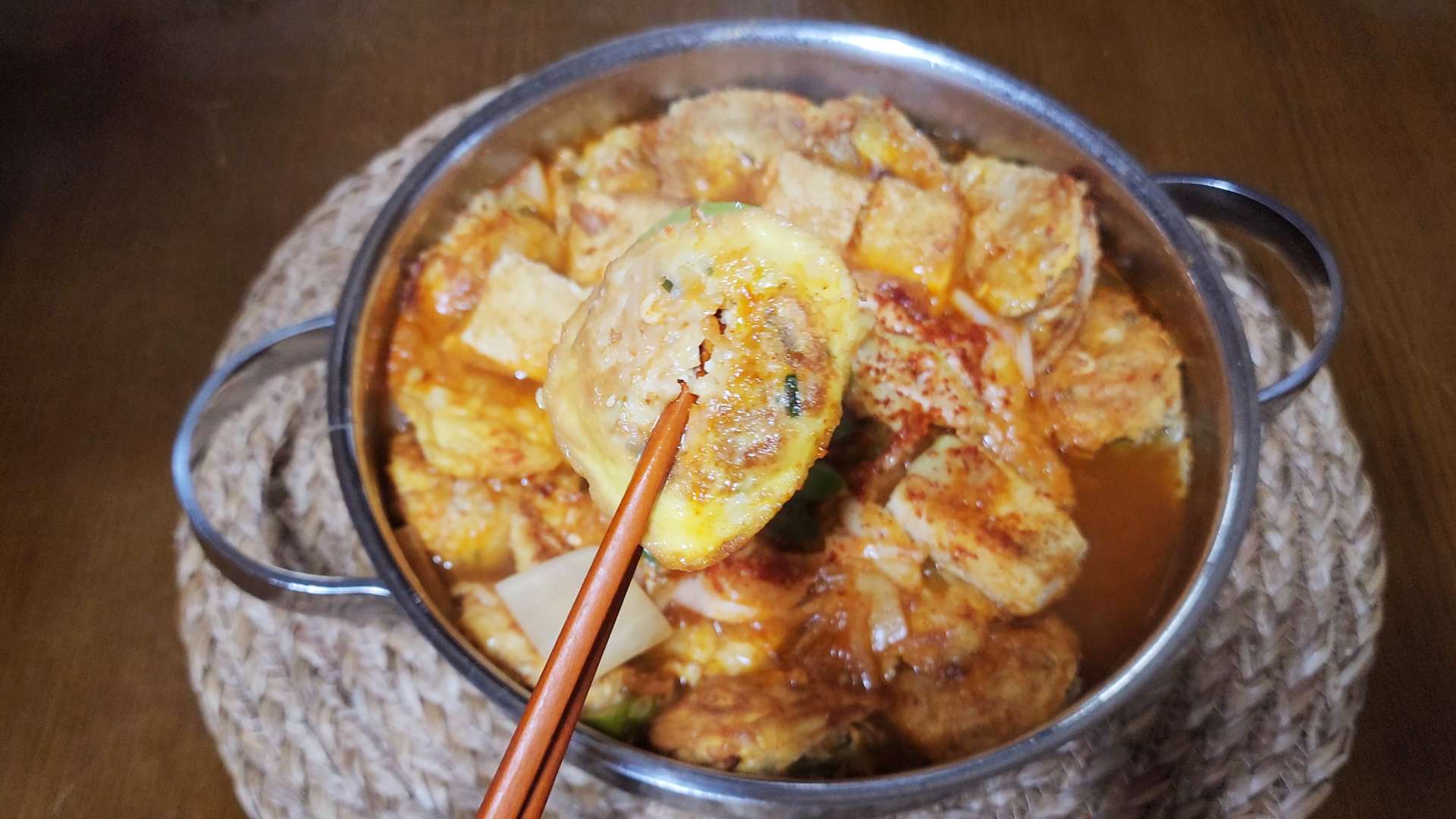 레시피: 남은전(동그랑땡, 동태전, 육전, 두부부침) 13장, 김치 1/2컵, 무 100g, 대파 1/2대, 청양고추 1개, 물 4컵, 멸치다시마팩 1개, 식용유