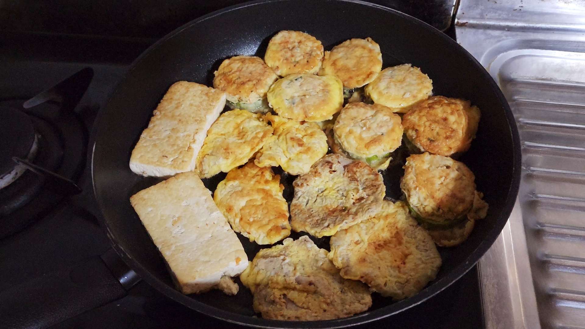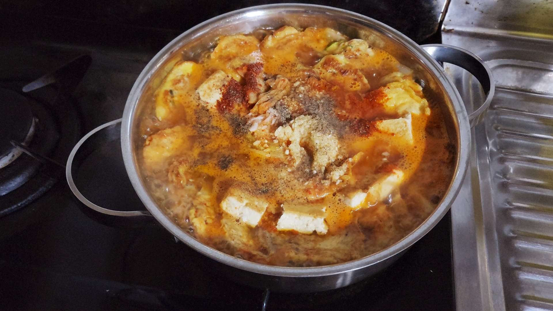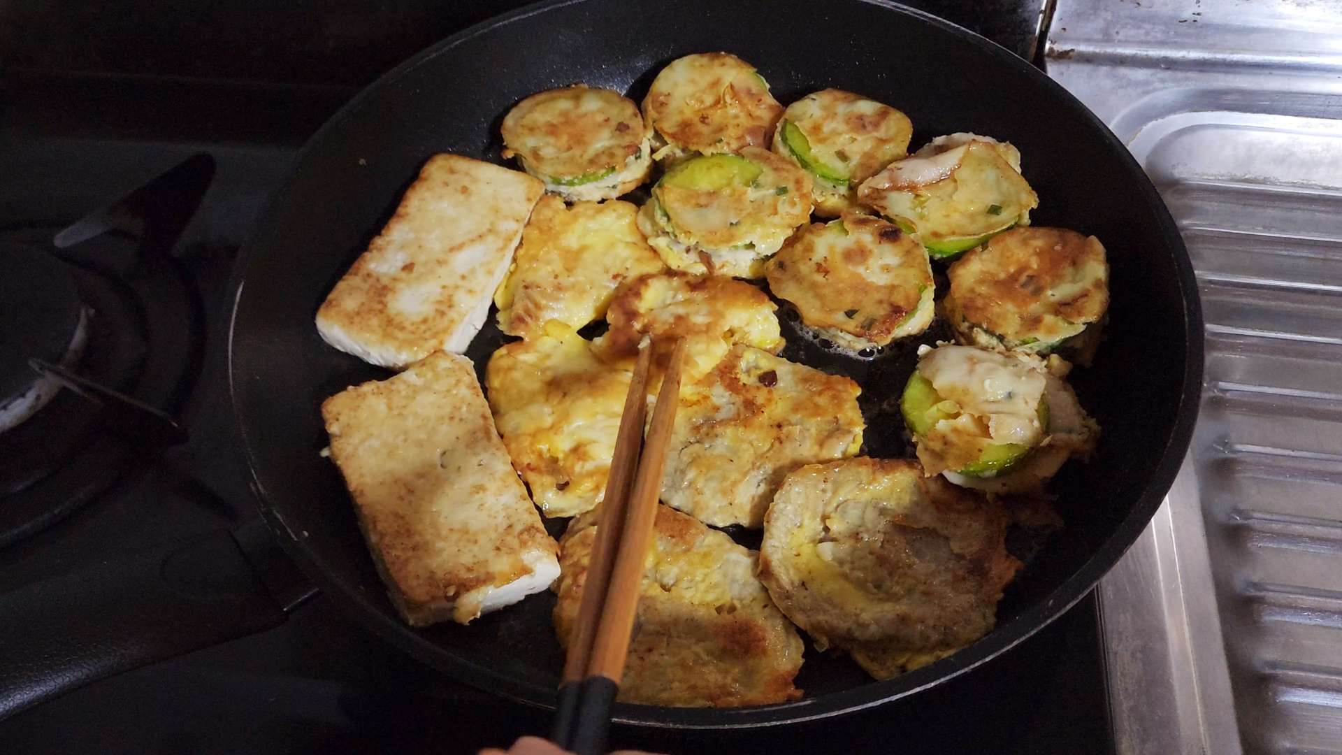 레시피: 남은전(동그랑땡, 동태전, 육전, 두부부침) 13장, 김치 1/2컵, 무 100g, 대파 1/2대, 청양고추 1개, 물 4컵, 멸치다시마팩 1개, 식용유