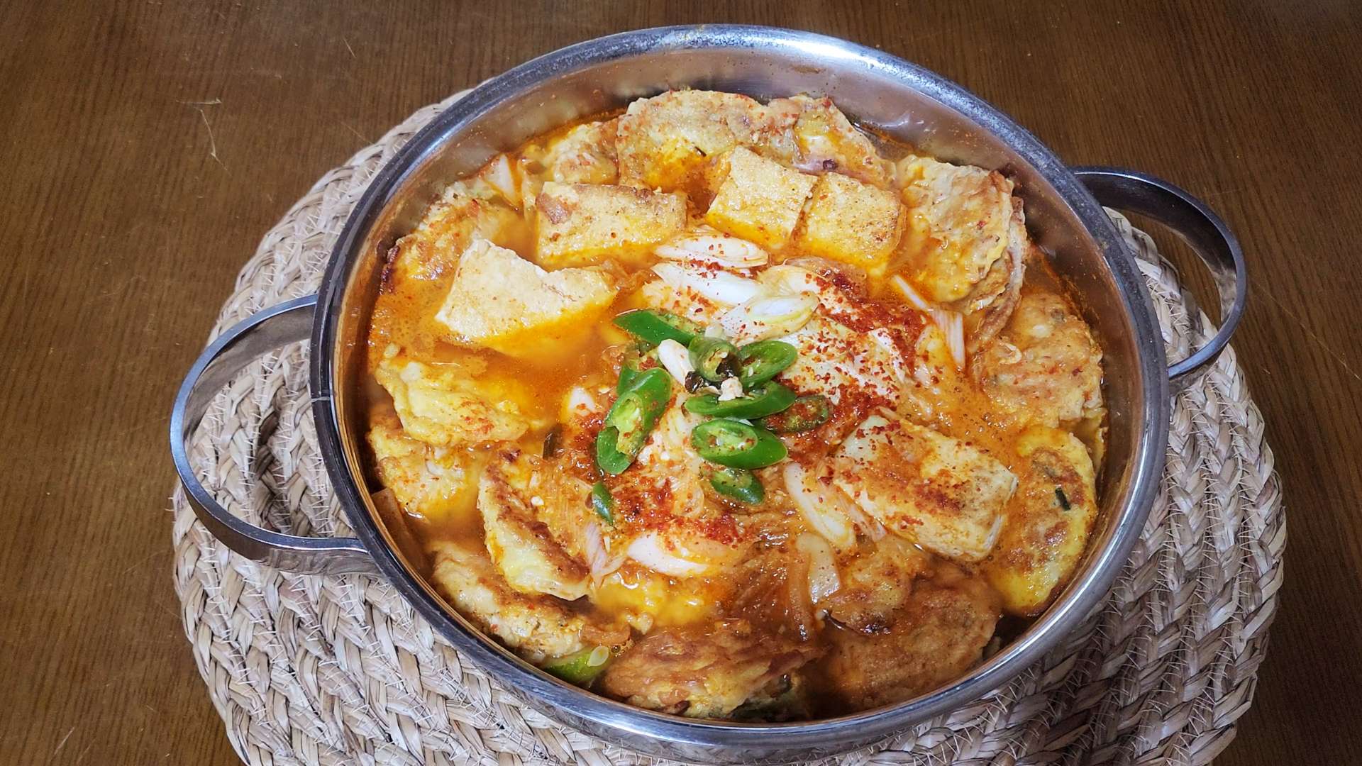 김치를 넣어 칼칼한 국물과 고소한 전이 맛있답니다.