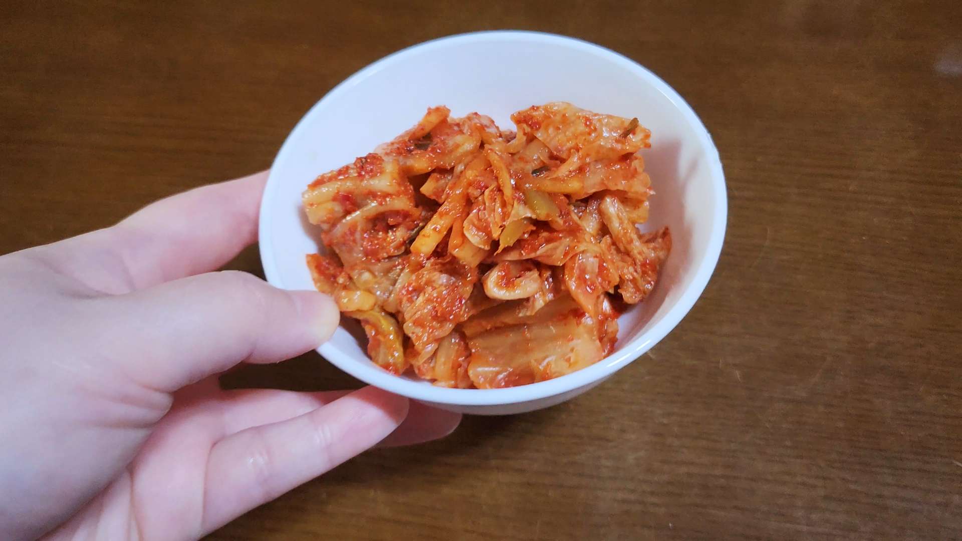 중앙에 김치 1/2컵, 다진마늘 1T를 올려줍니다.