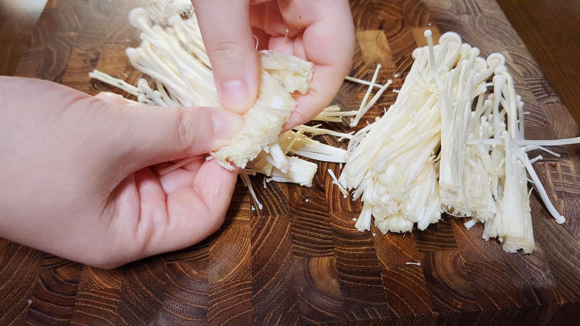 팽이버섯은 밑동을 자르고 찢어줍니다.