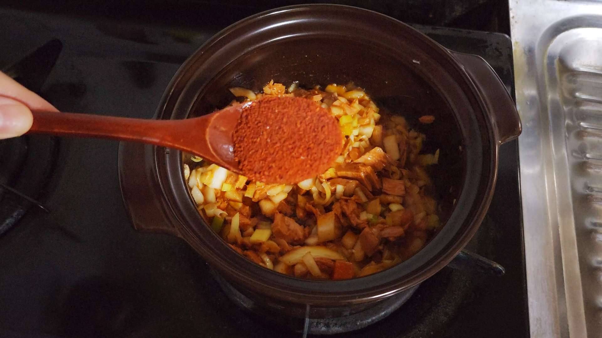 고춧가루 2T, 소금 0.3t, 설탕 0.3t을 넣고 볶아줍니다.