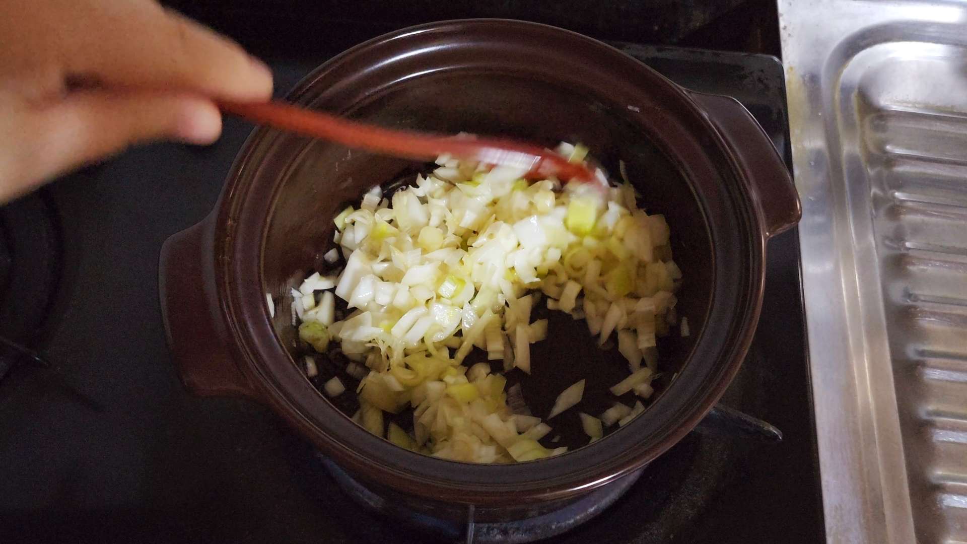 중불로 달군 냄비에 참기름 2T, 다진 대파, 다진 양파를 볶아줍니다.