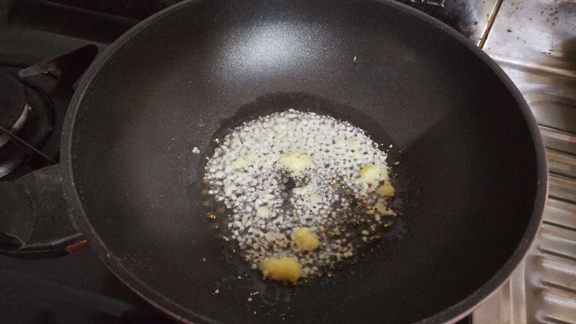 약불로 달군팬에 식용유, 다진마늘 1T를 넣고 볶아줍니다.