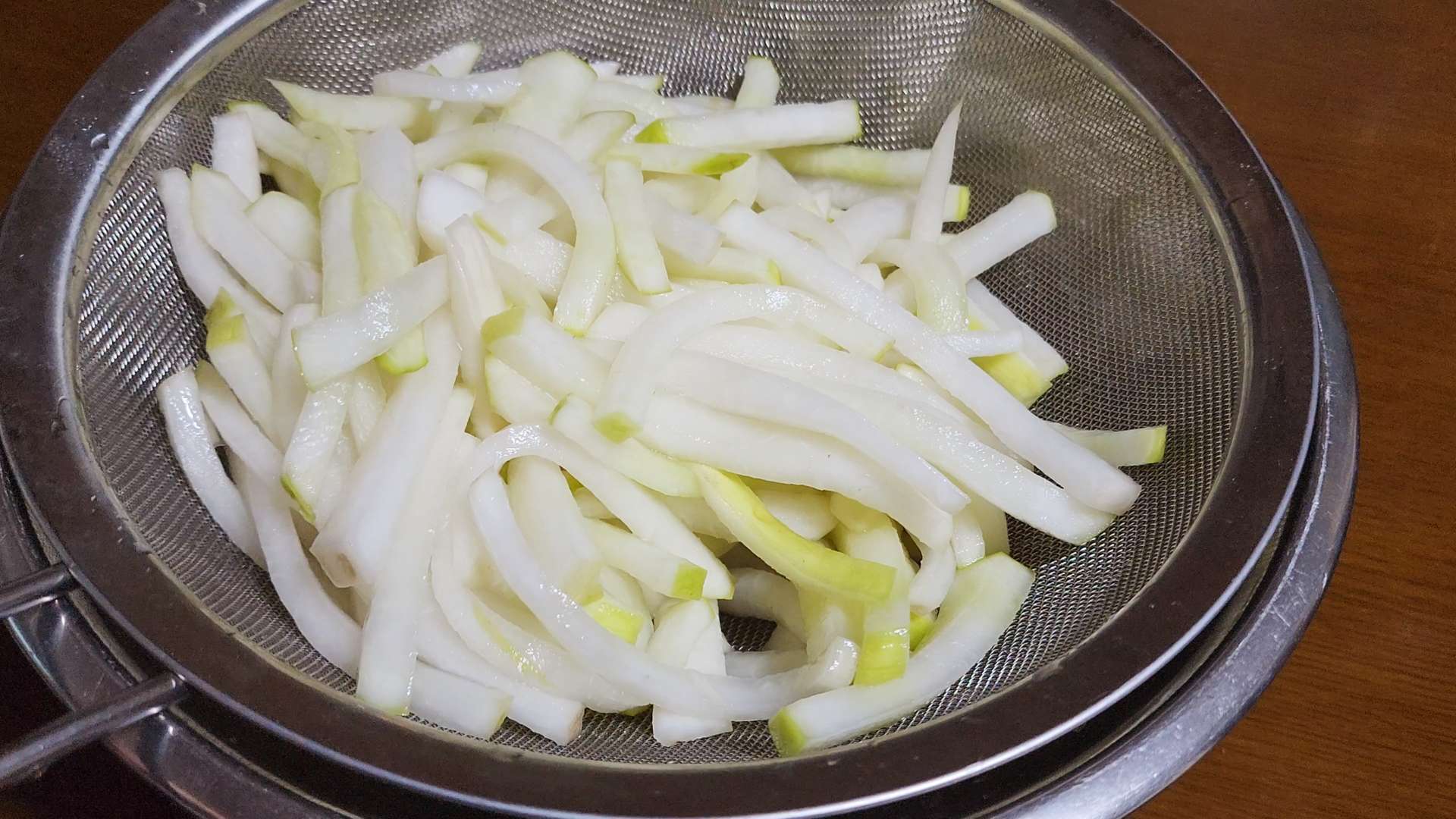 절여진 물은 버리고 찬물에 한번 헹구고 물기를 빼줍니다.