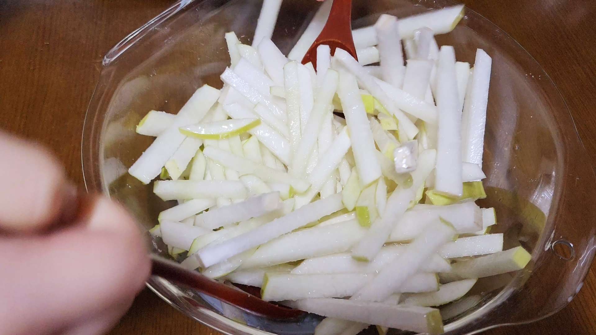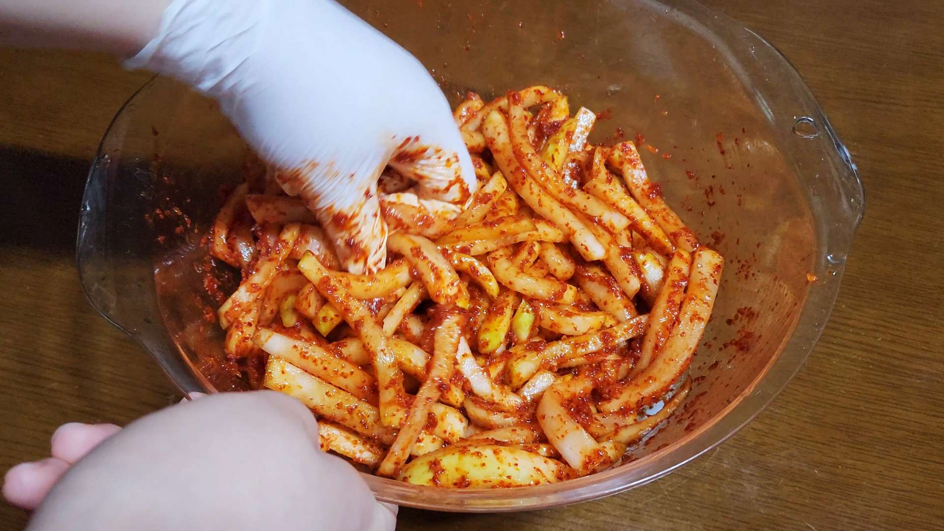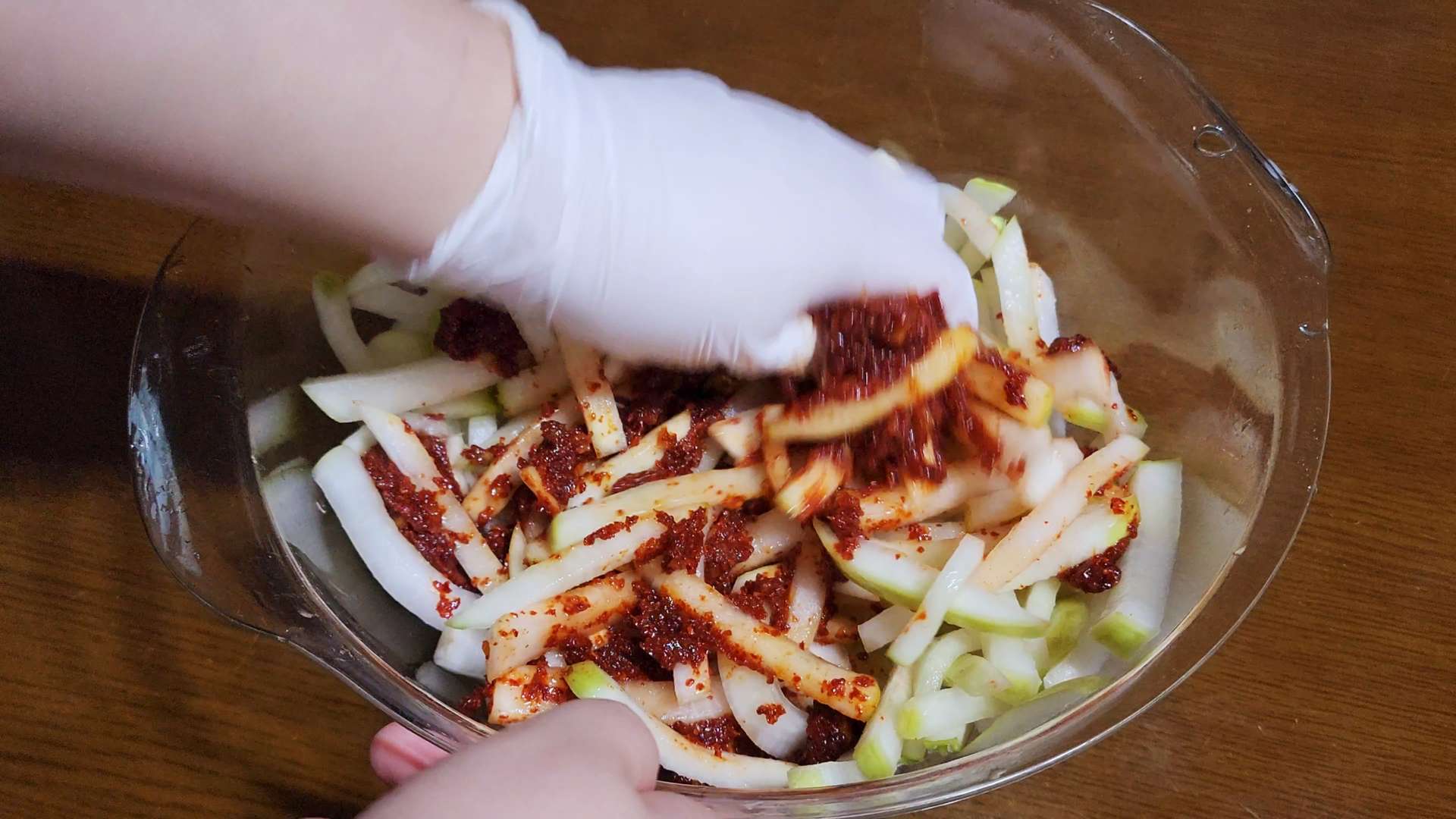 볼에 무, 양념장을 넣고 무쳐줍니다.