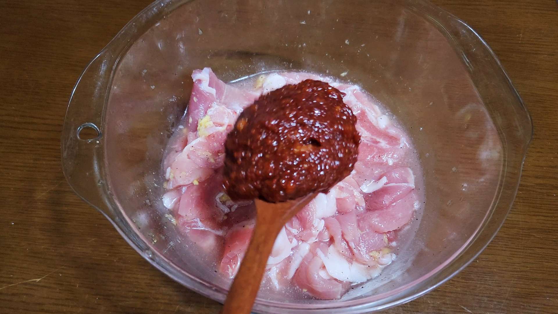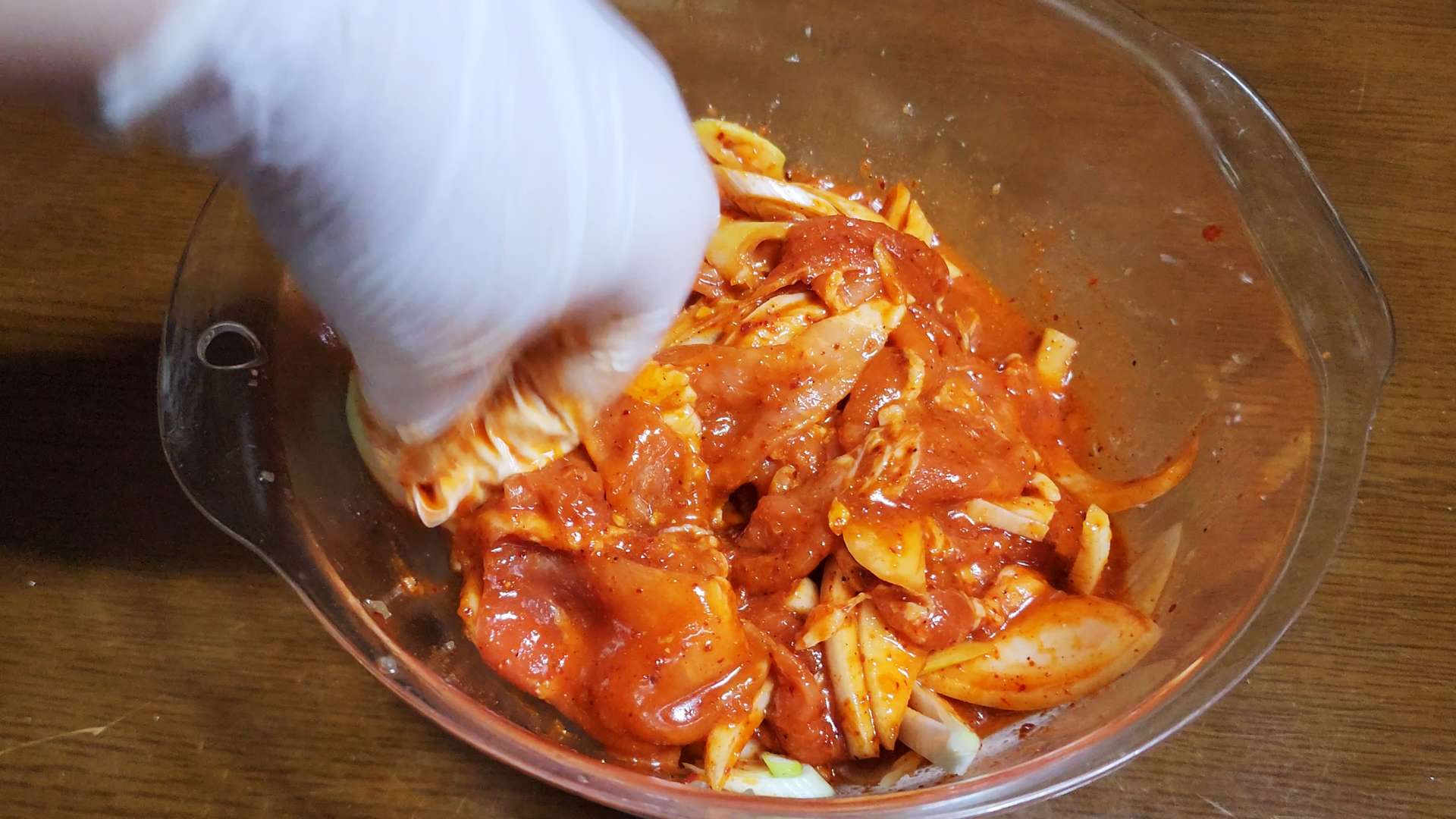 돼지고기에 양념장을 넣고 버무려줍니다.
