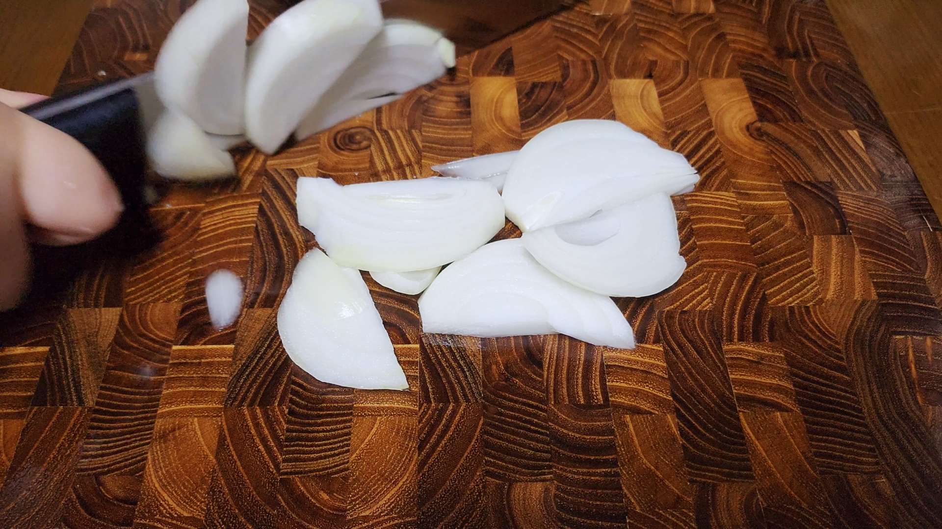 재료: 돼지고기 앞다리살 250g, 양파 1/2개, 대파 10cm, 식용유