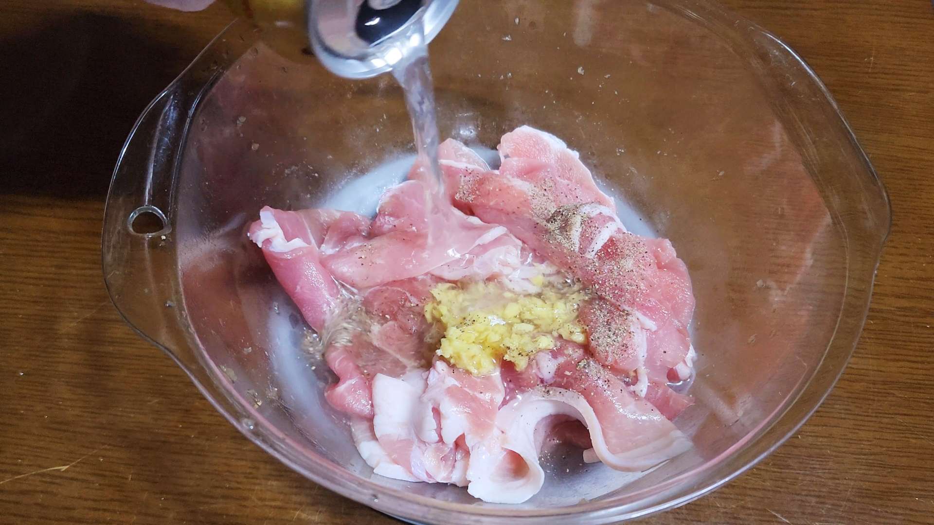 돼지고기 250g, 청주 1T, 다진 생강 0.3T, 후춧가루, 배 음료 100ml를 넣어 밑간해 10분 재워줍니다.
