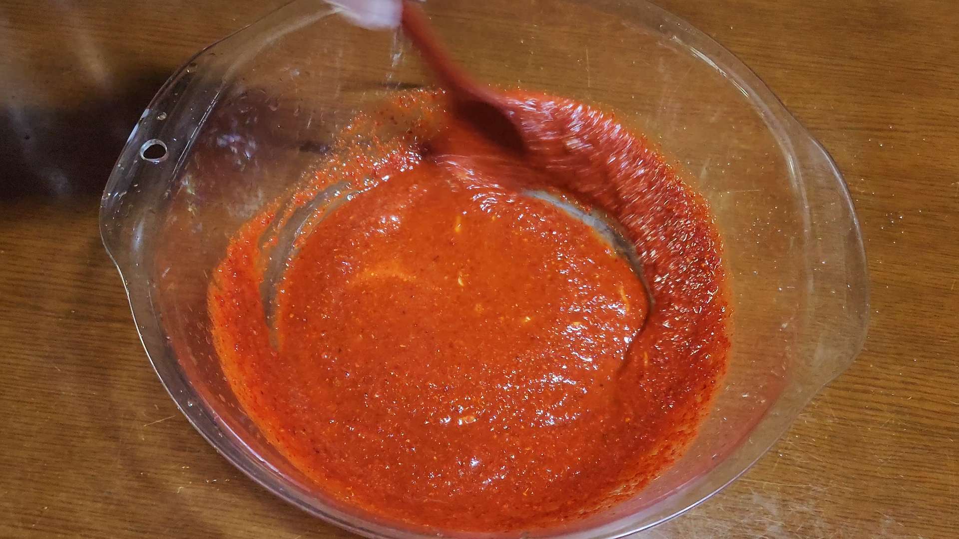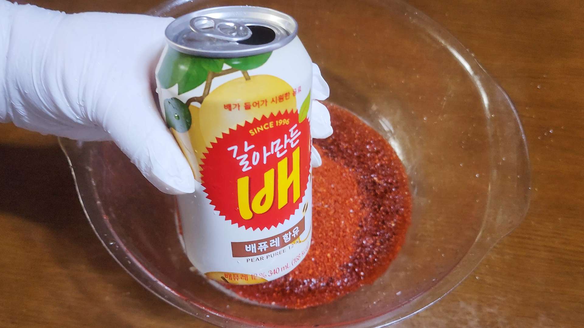 절인 쪽파는 덜어두고 남은 멸치액젓에 고춧가루 1컵, 갈아 만든 배음료 120ml, 매실청 3T, 새우젓 1T을 넣고 섞어줍니다.