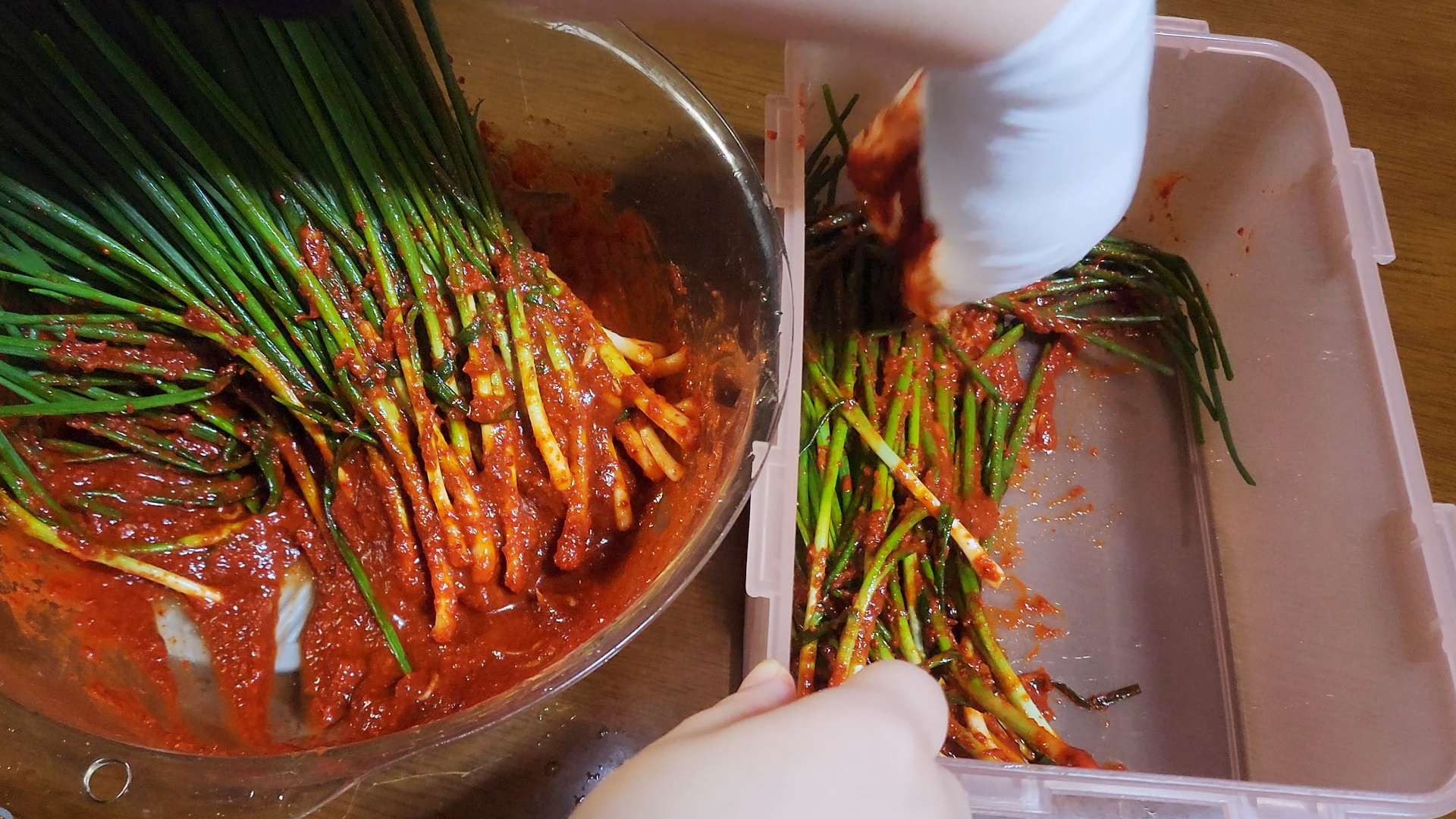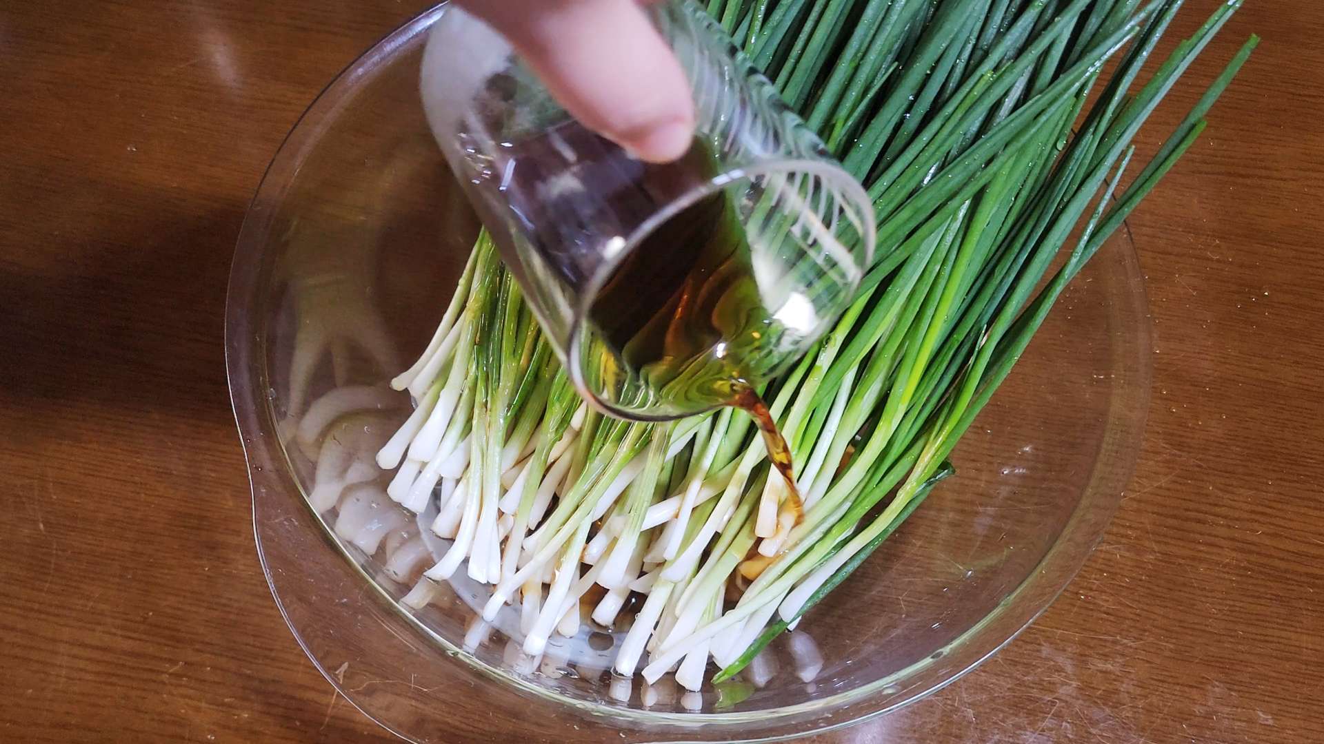 재료: 쪽파 한단, 멸치액젓 100ml, 갈아 만든 배음료 120ml, 매실청 3T, 새우젓 1T, 고춧가루 180ml
