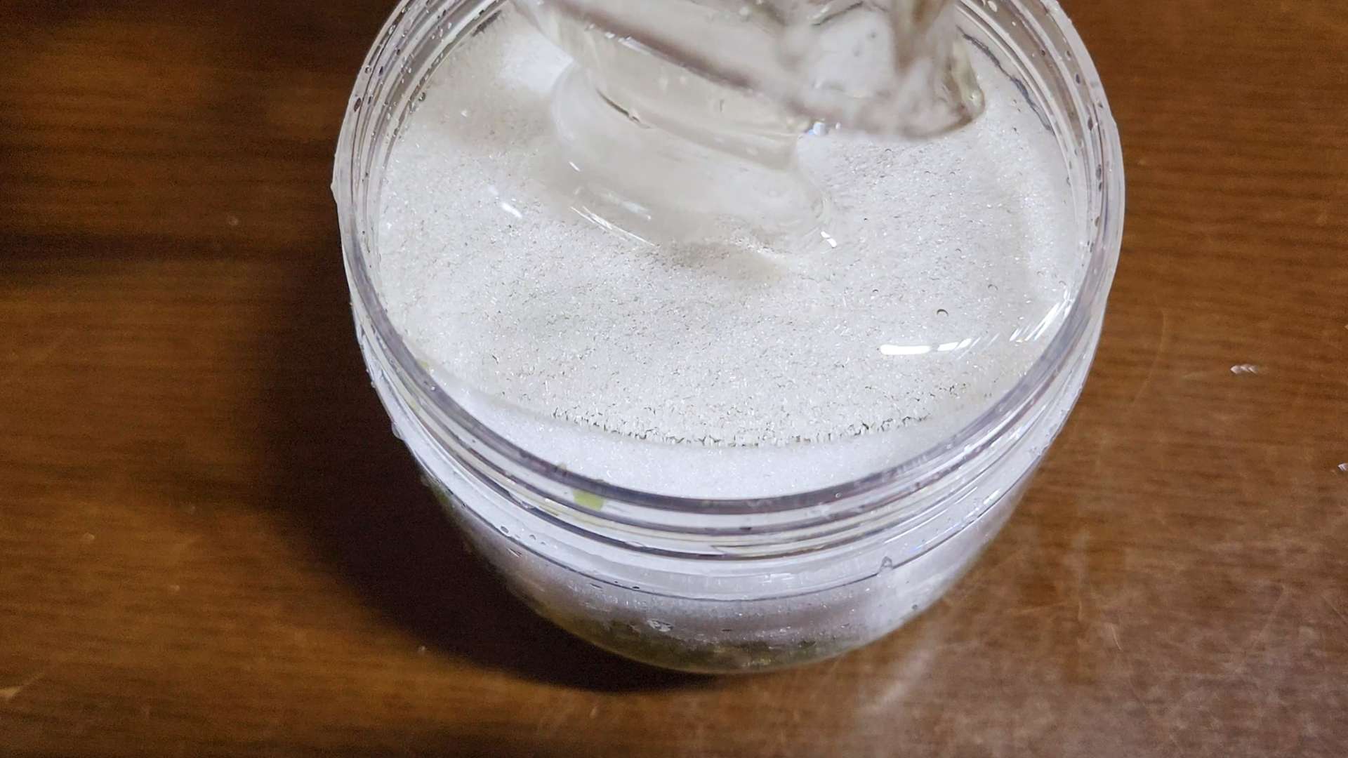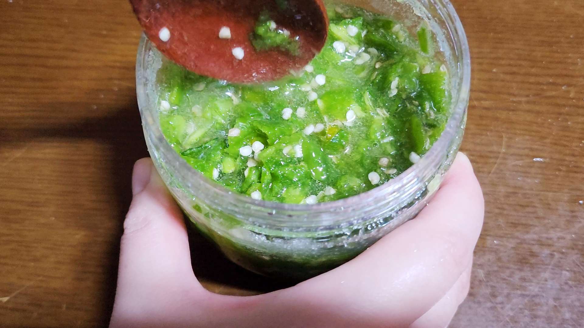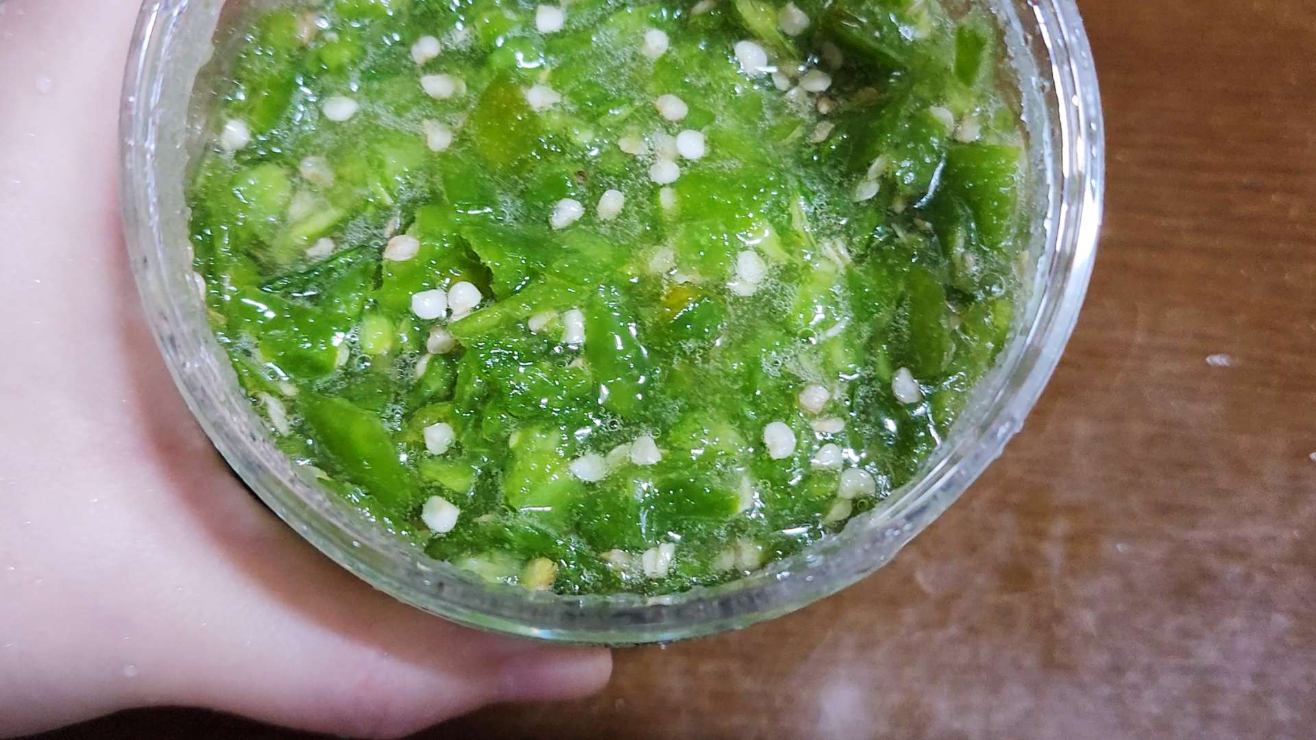 소독한 병에 다진 청양고추를 넣고 설탕 100g, 올리고당 100g을 넣어줍니다.