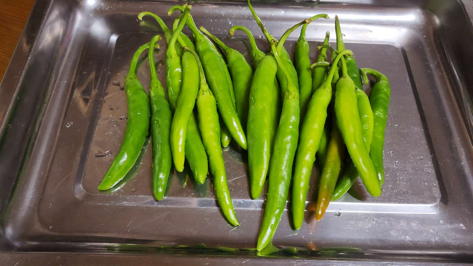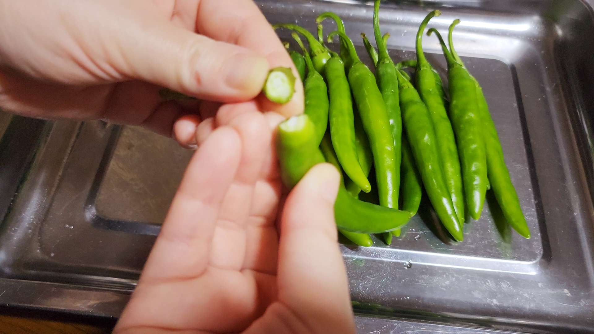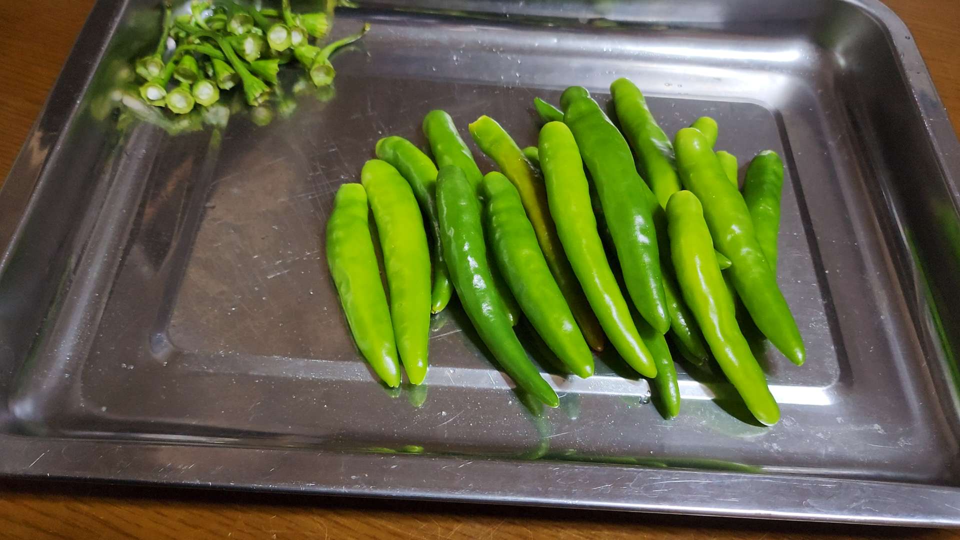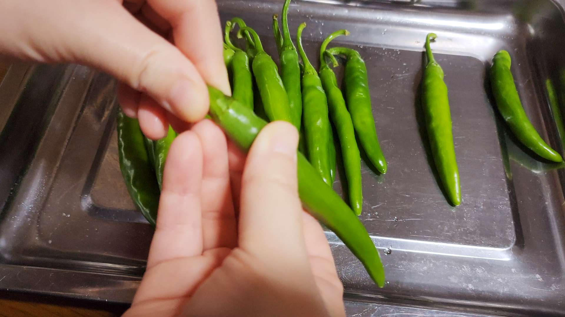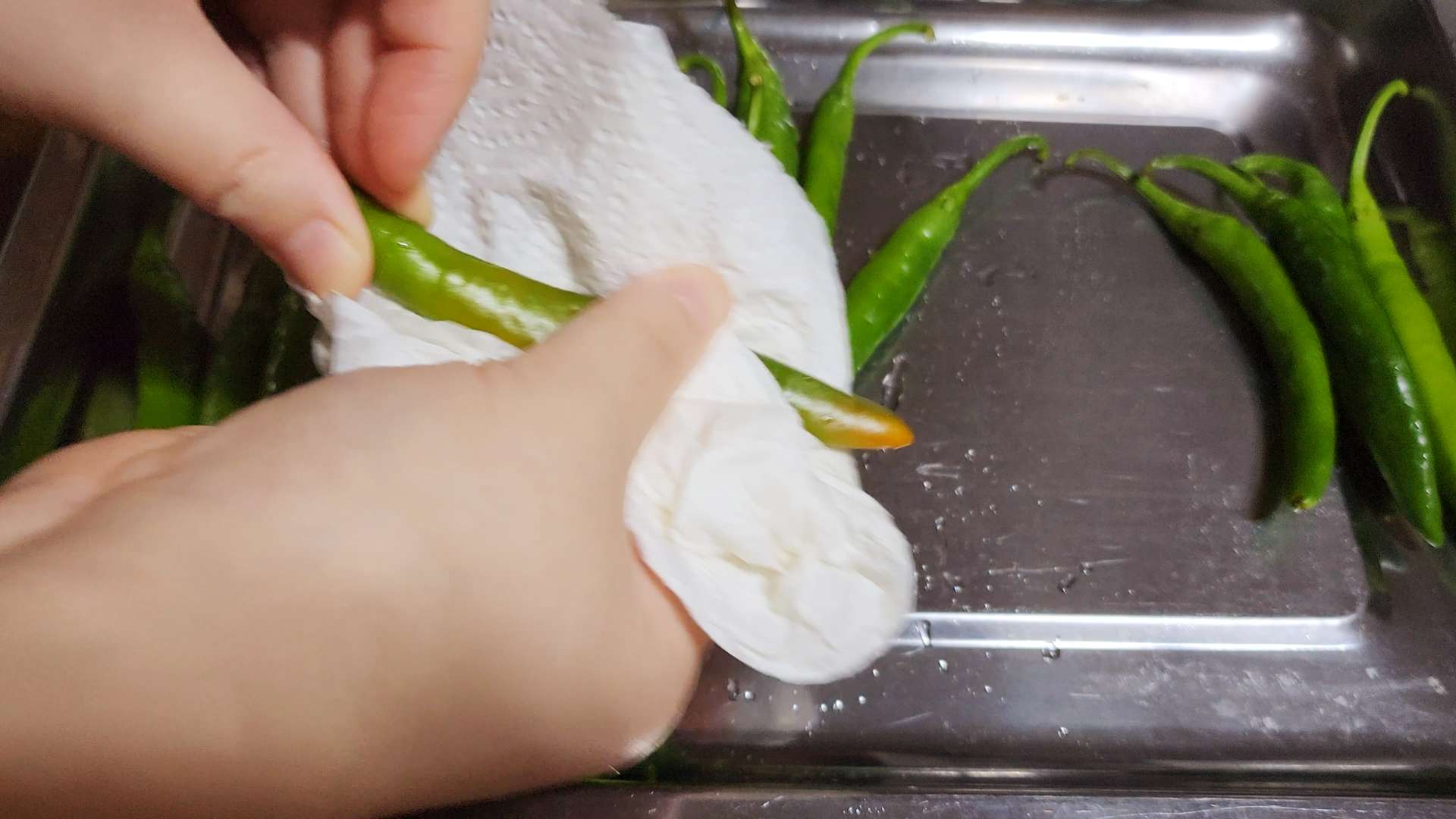 씻은 청양고추의 물기를 완전히 제거해줍니다.