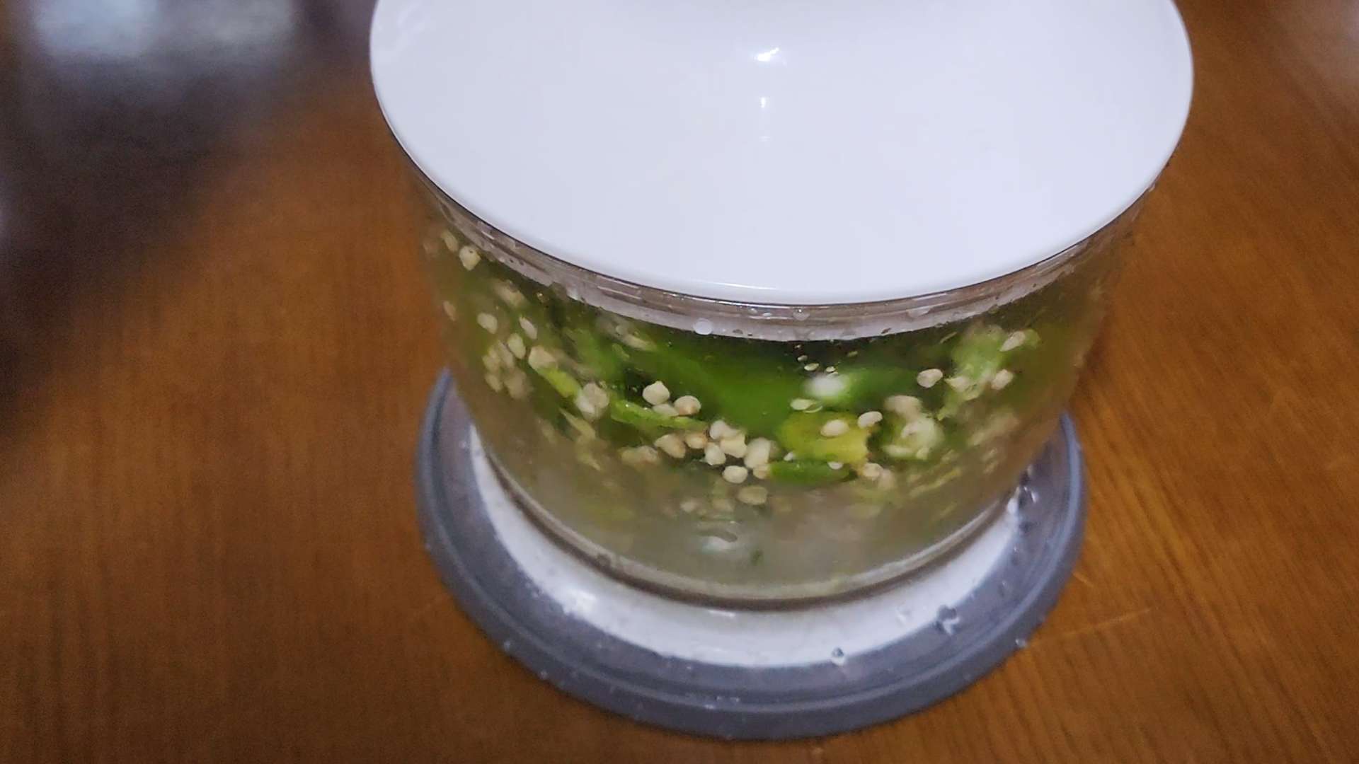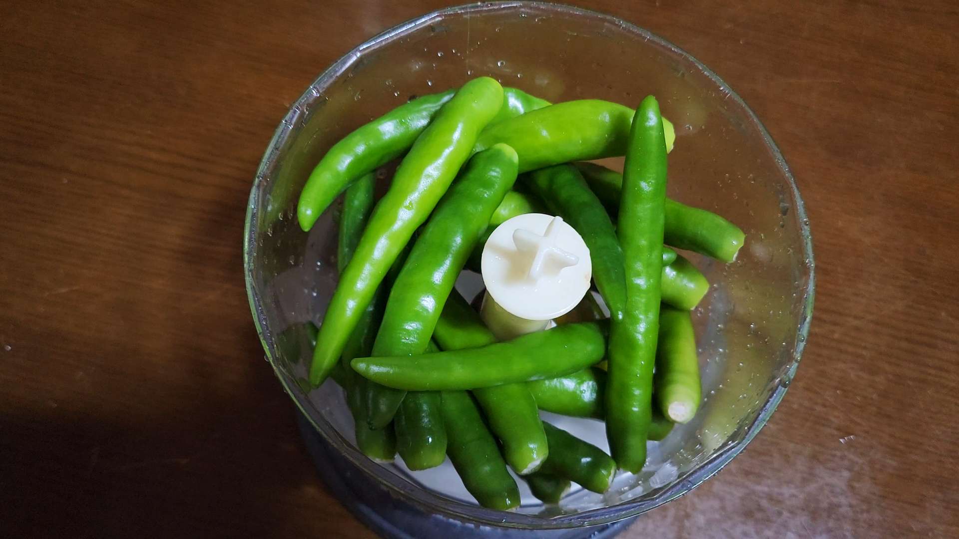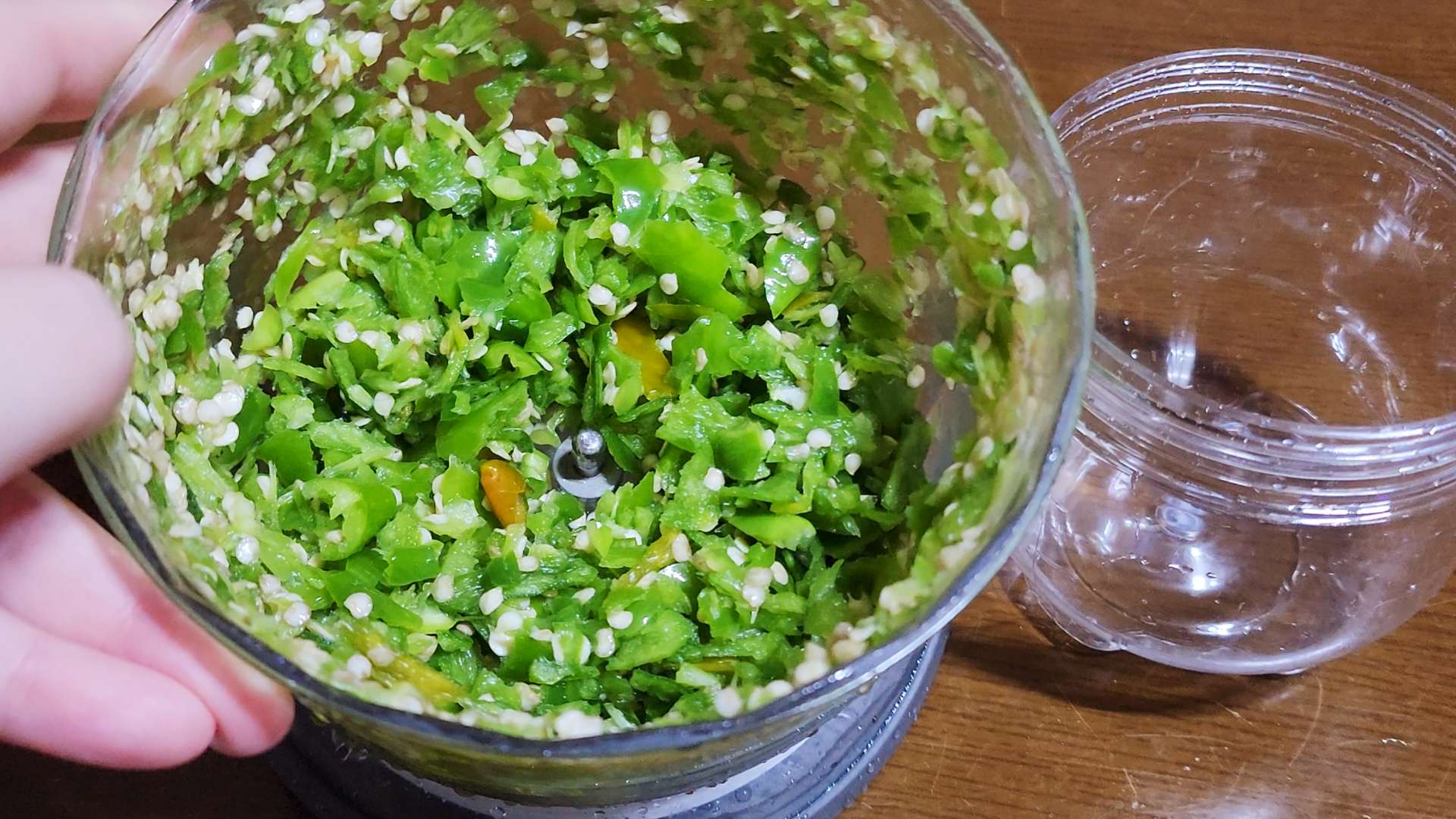 다지기에 청양고추를 넣고 곱지 않게 다져줍니다.