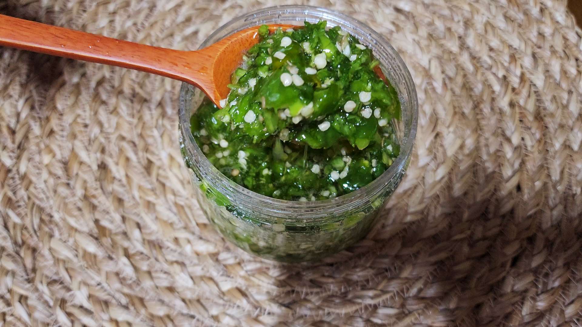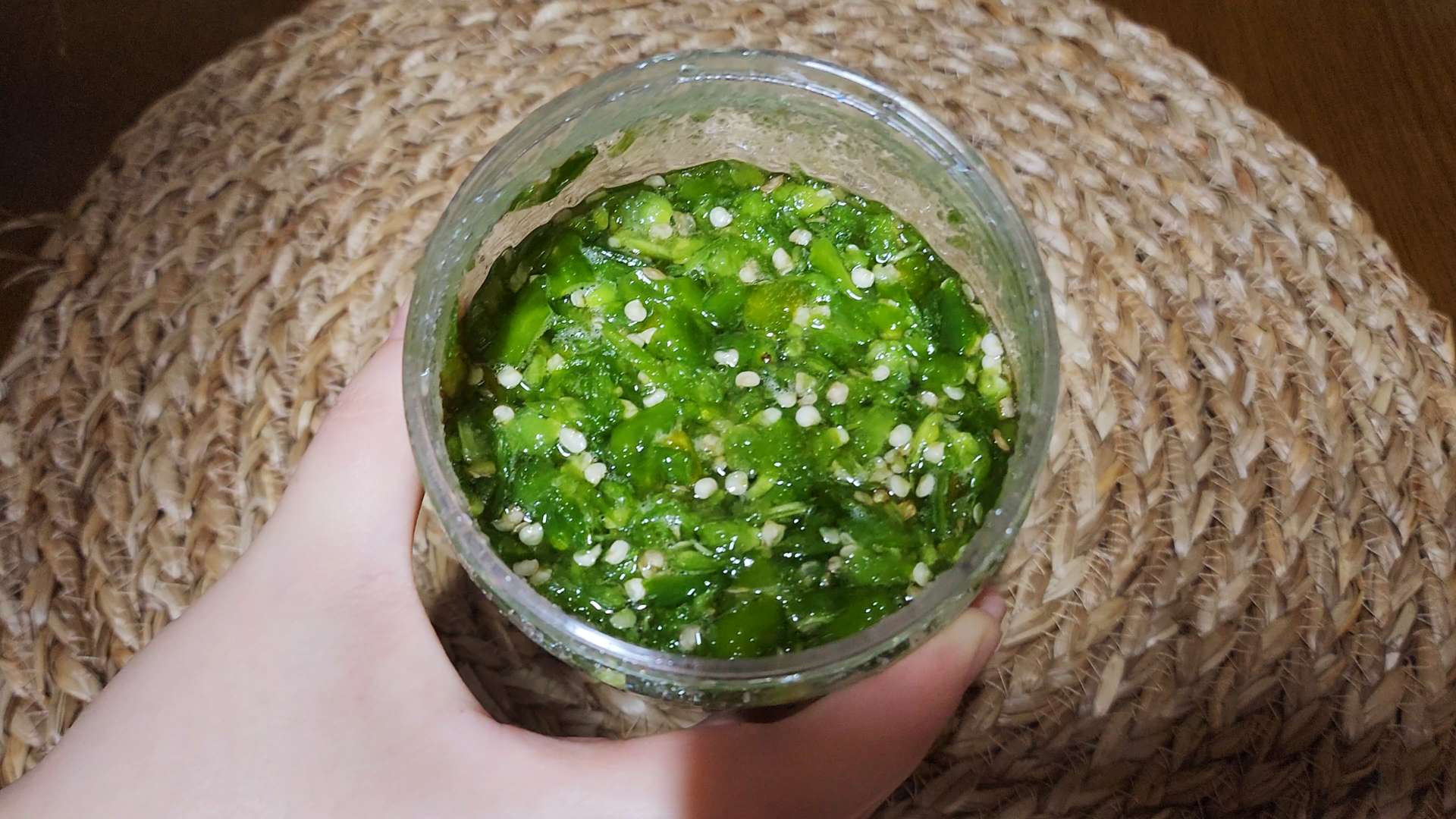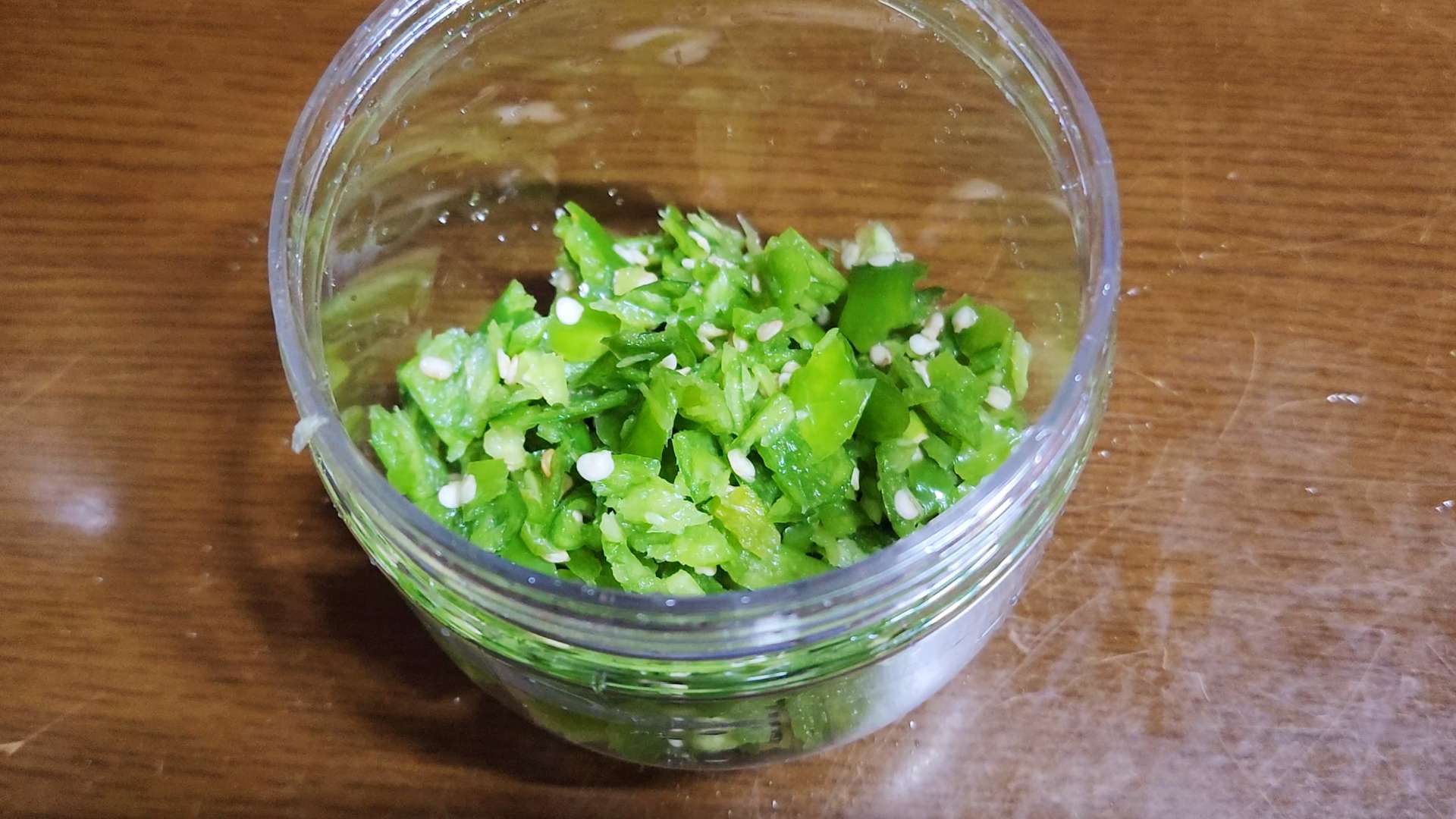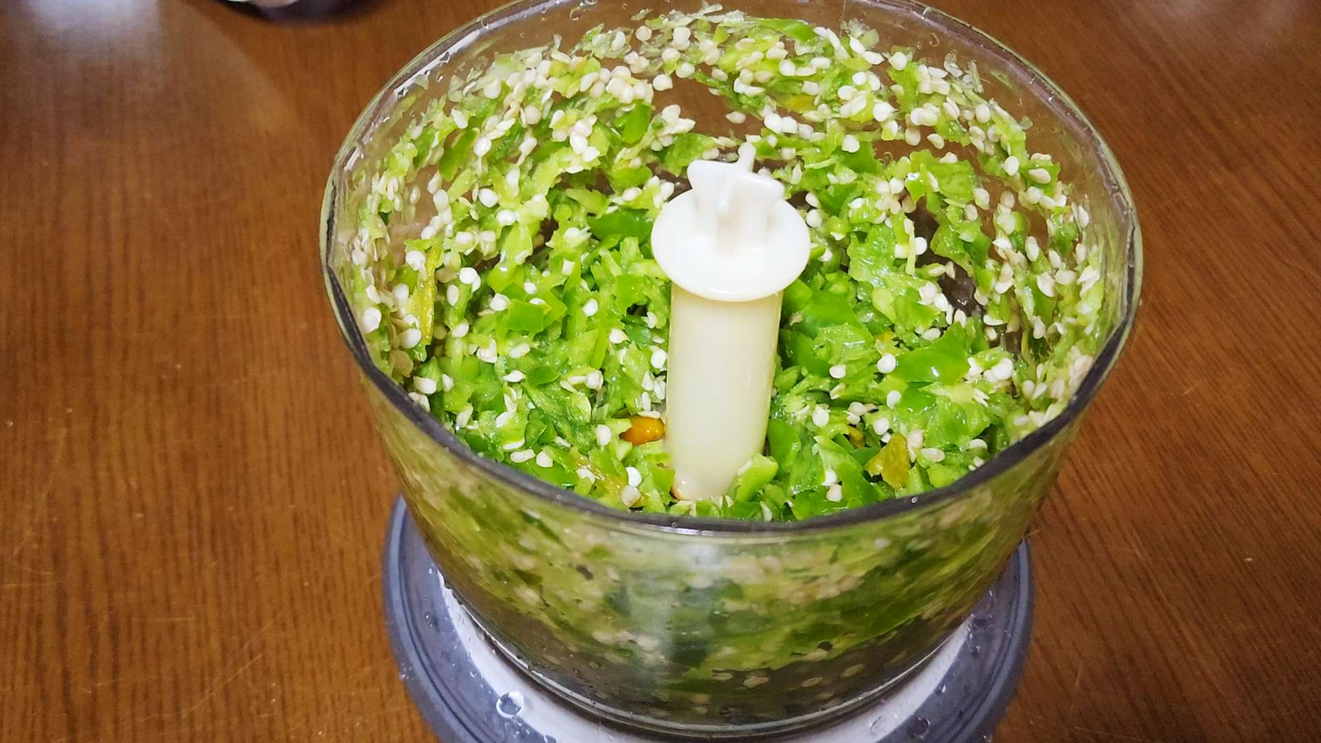 다지기에 청양고추를 넣고 곱지 않게 다져줍니다.