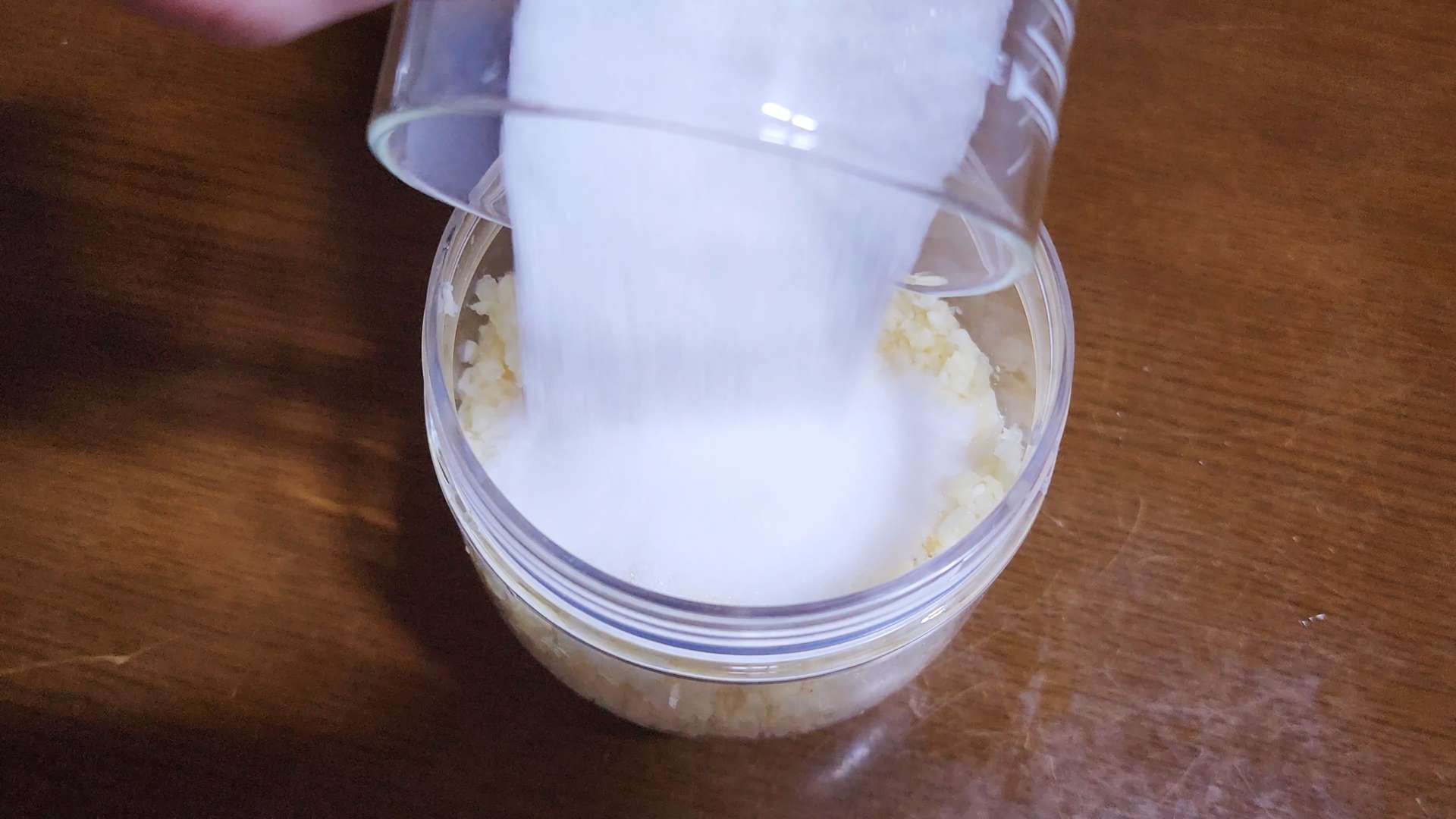 소독한 병에 다진 마늘을 넣고 설탕 100g, 올리고당 100g을 넣고 섞어줍니다.