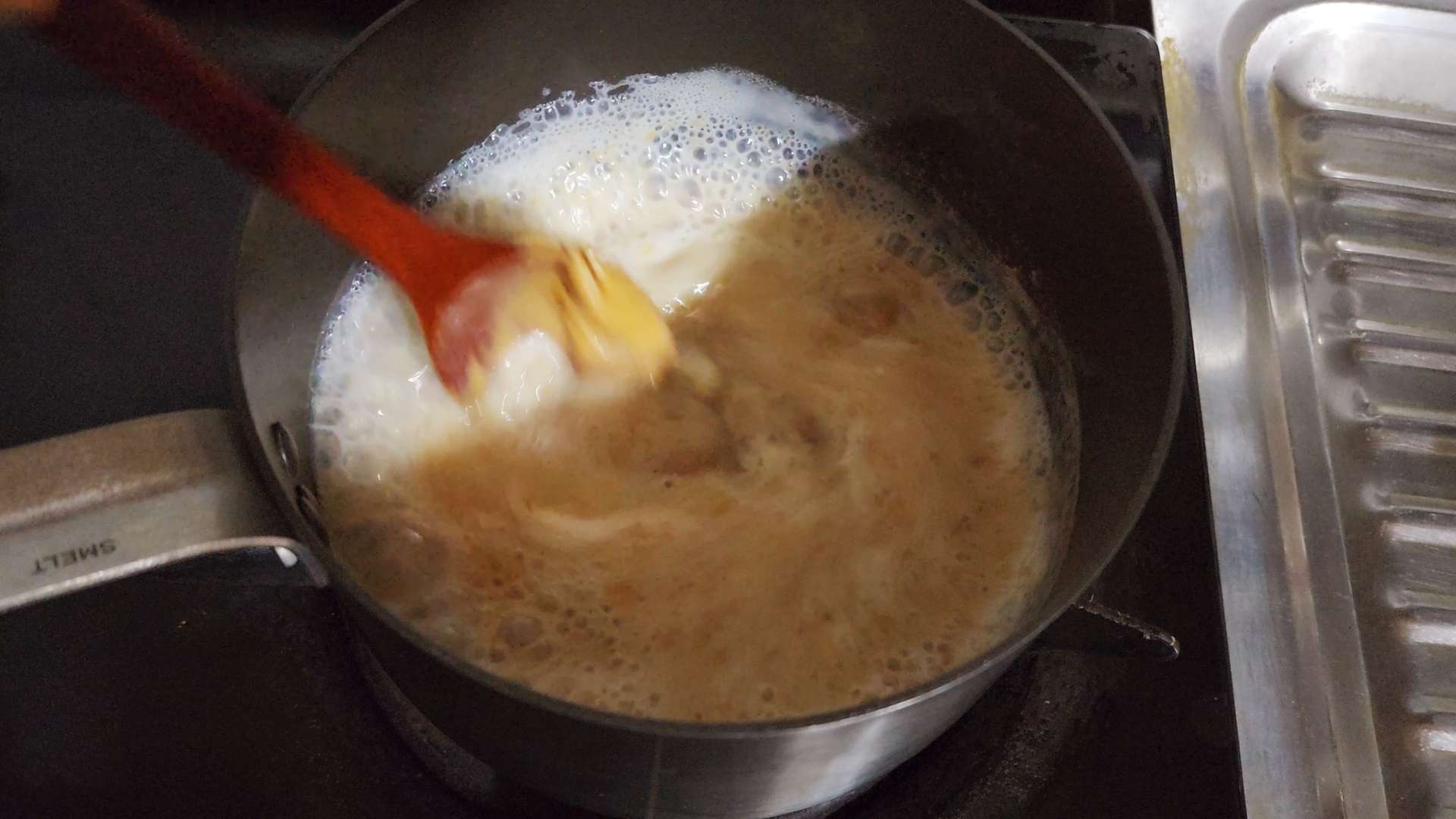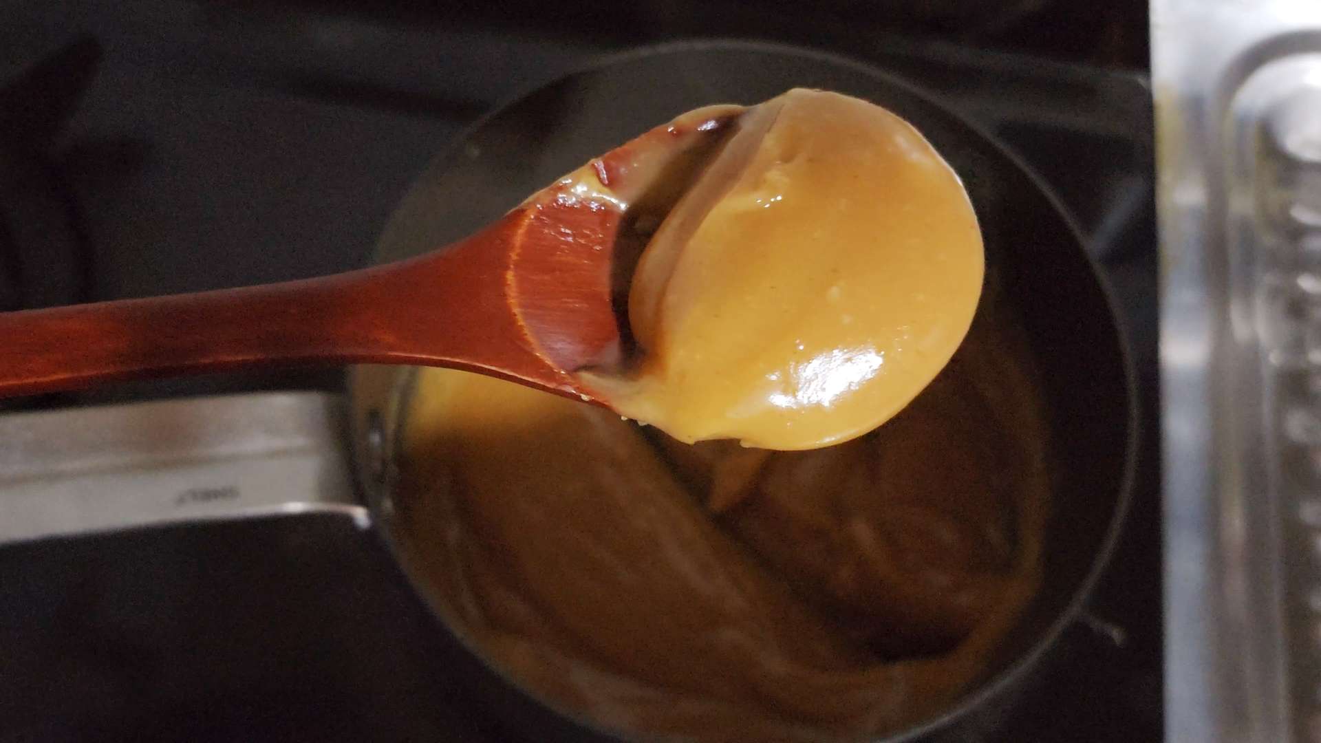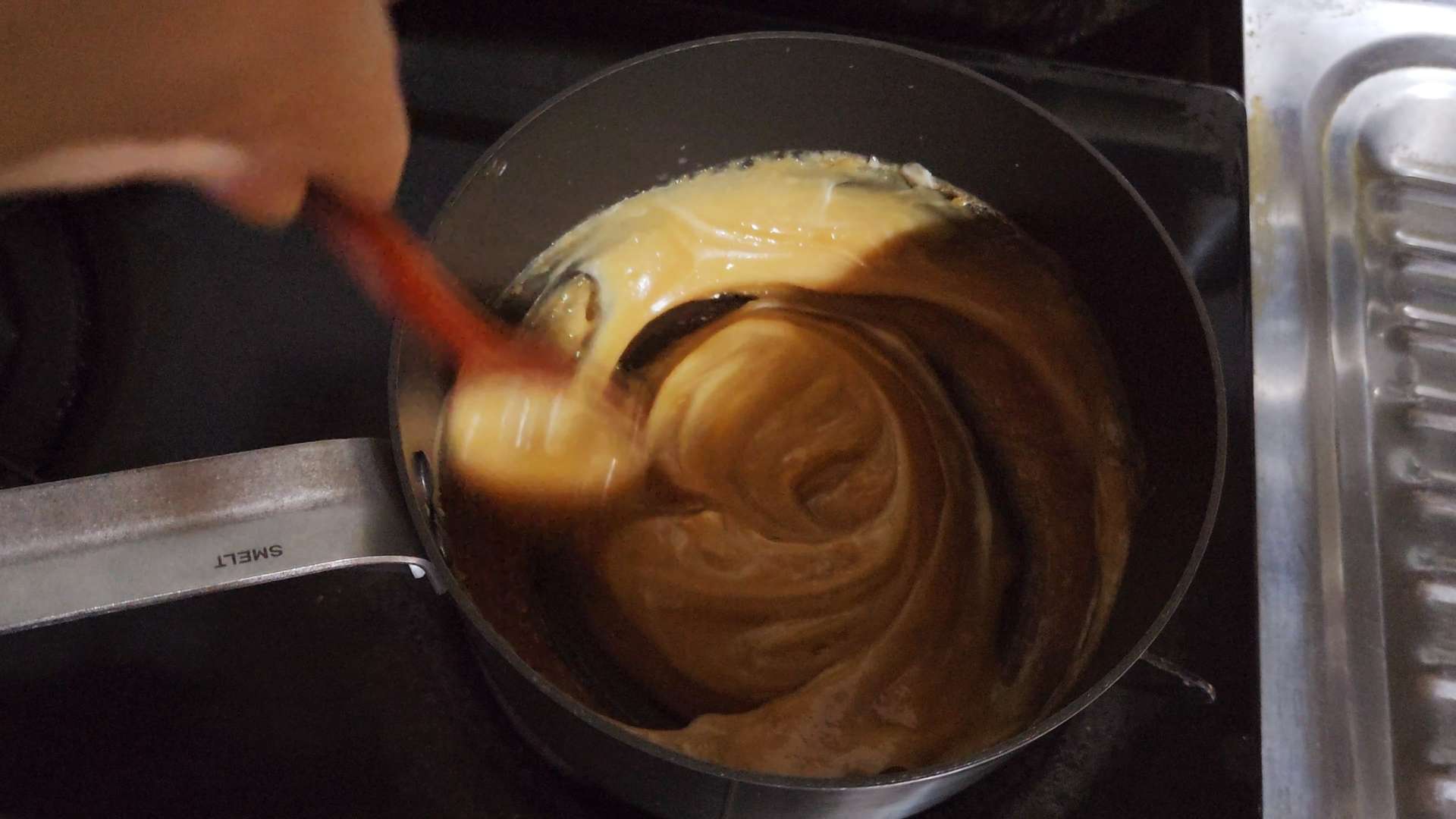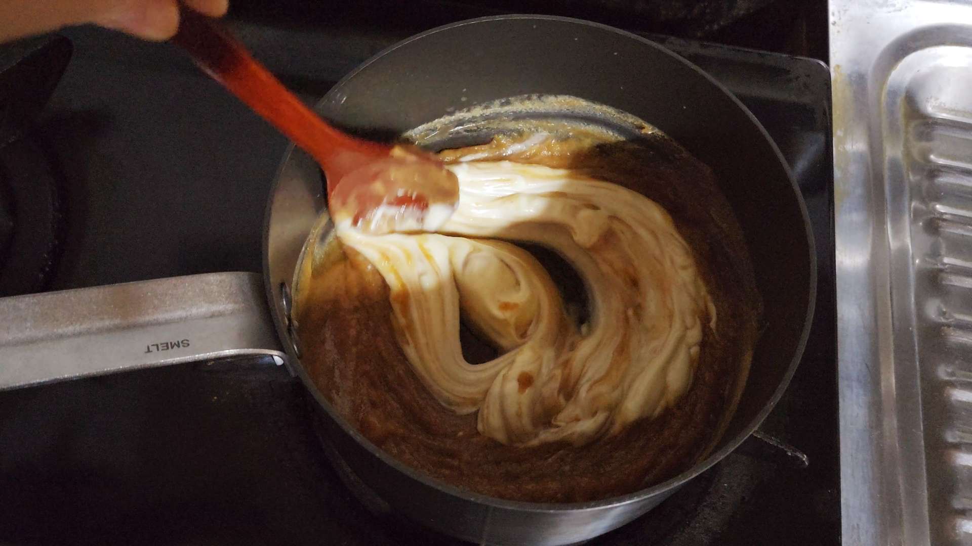 설탕이 녹으면 땅콩버터 듬뿍 3T를 넣고 소스처럼 될 때까지 잘 섞어줍니다.