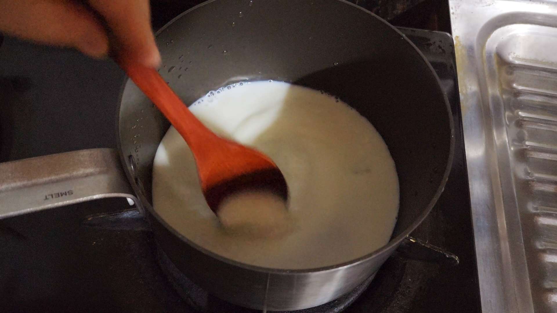 중불로 예열한 팬에 우유 100ml, 설탕 4T를 넣고 약불에서 섞어줍니다.