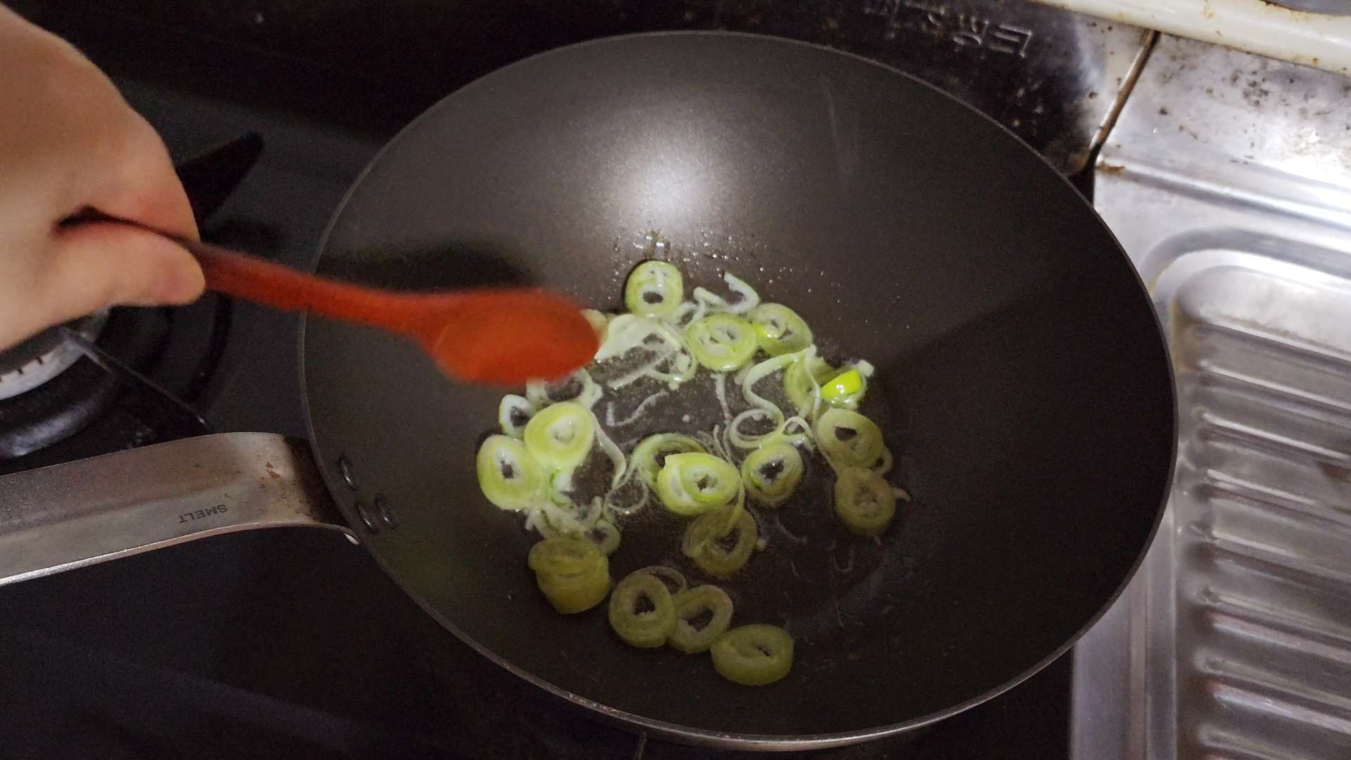 팬에 기름을 두른 후 대파를 넣어 30초 정도 볶다가 감자를 넣고 3분 정도 볶아줍니다.