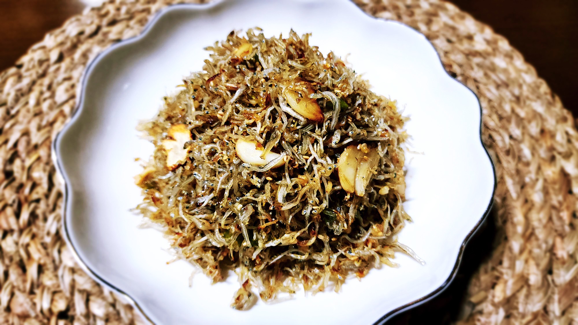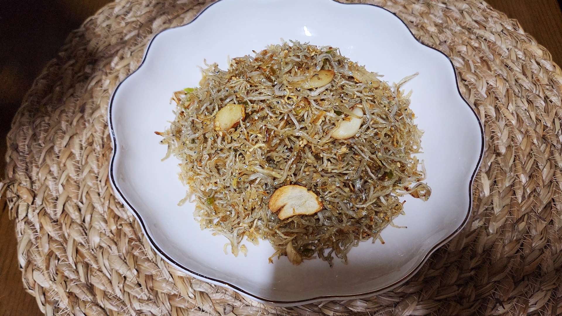 재료: 멸치 150g, 마늘 5개, 고추청 1T, 마늘청 1T, 간장 2T, 참기름 1T, 통깨