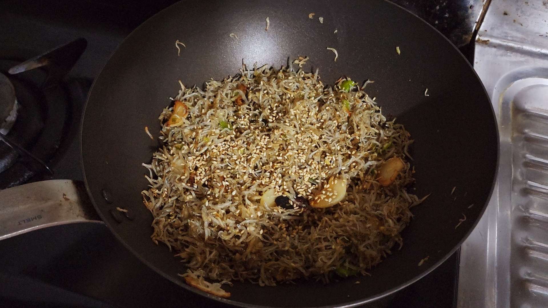 불을 끄고 참기름, 통깨를 넣고 섞어줍니다.