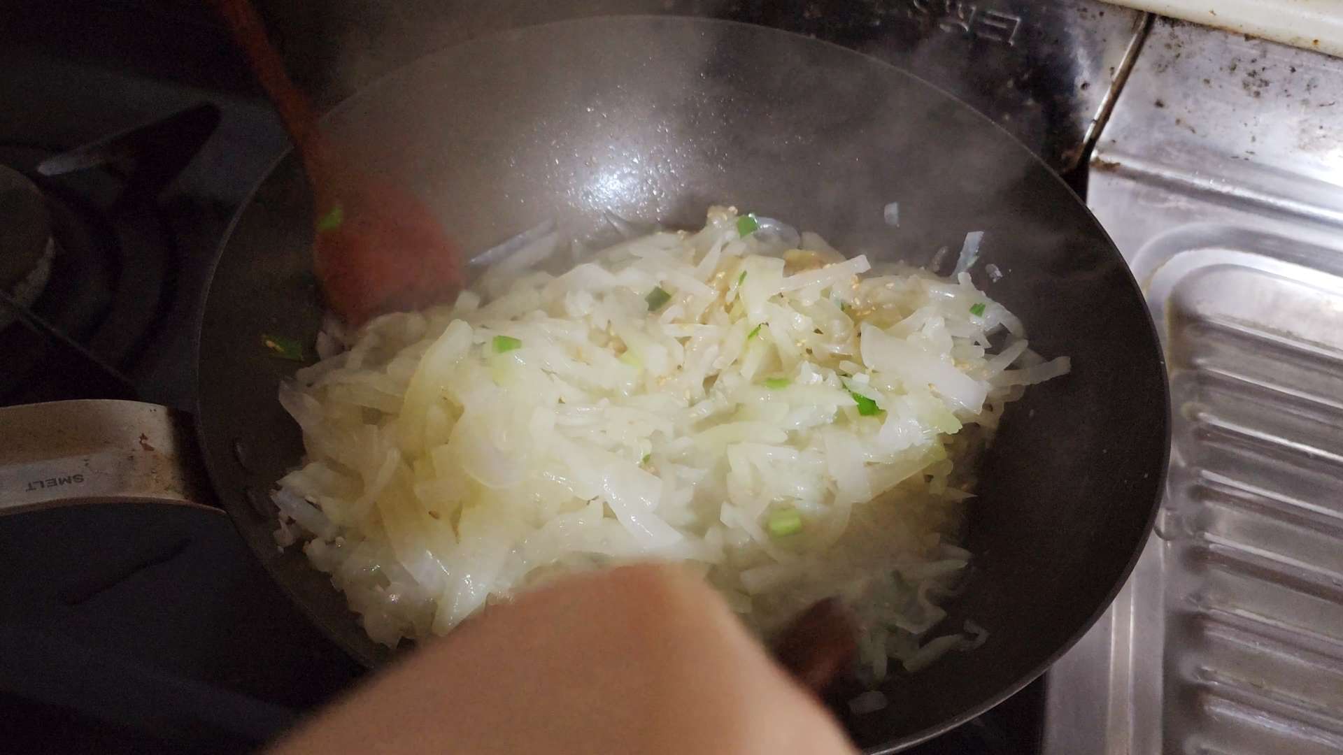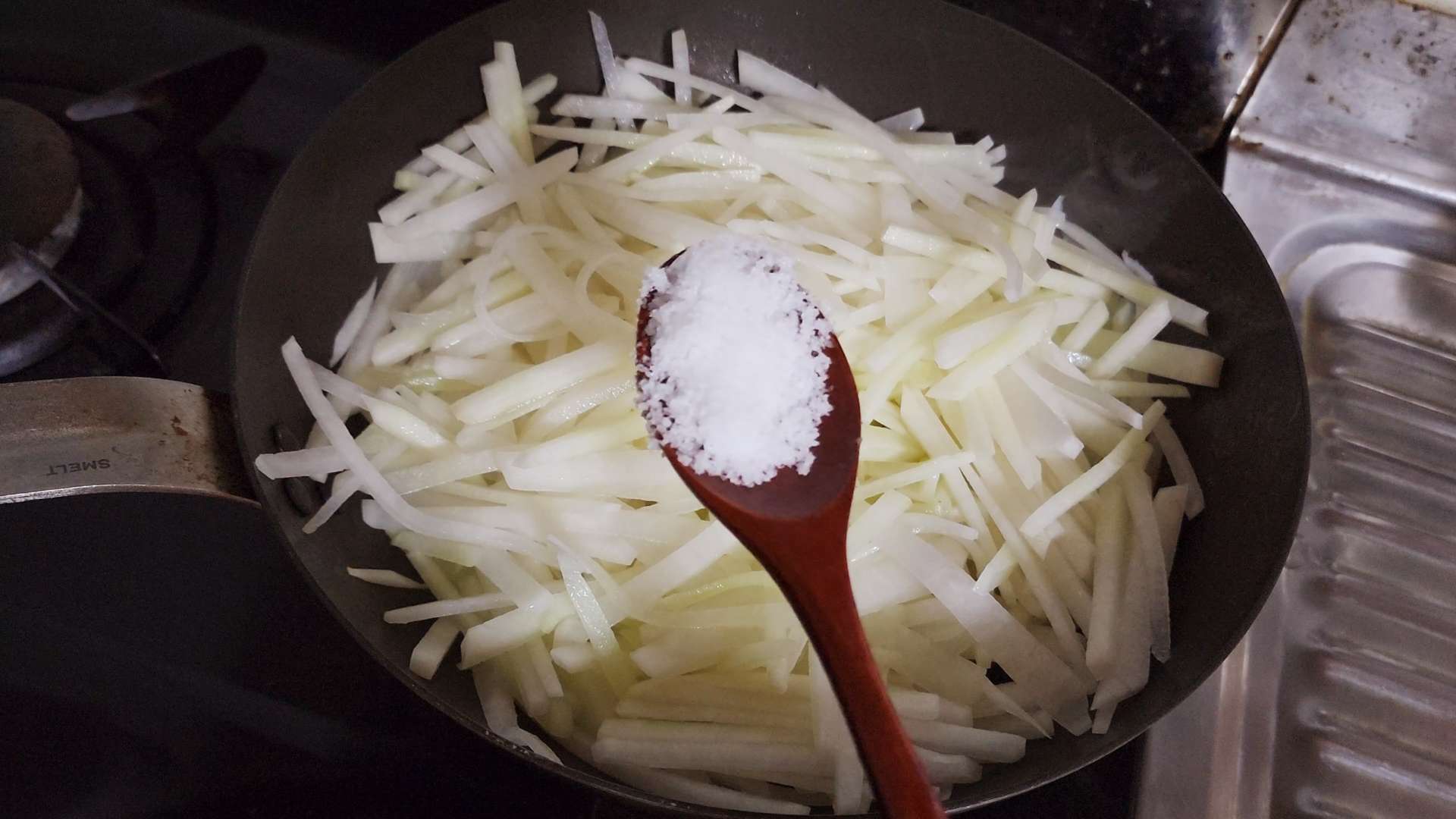 중불로 달군팬에 식용유를 두르고 채썬 무를 넣고 볶아줍니다.
