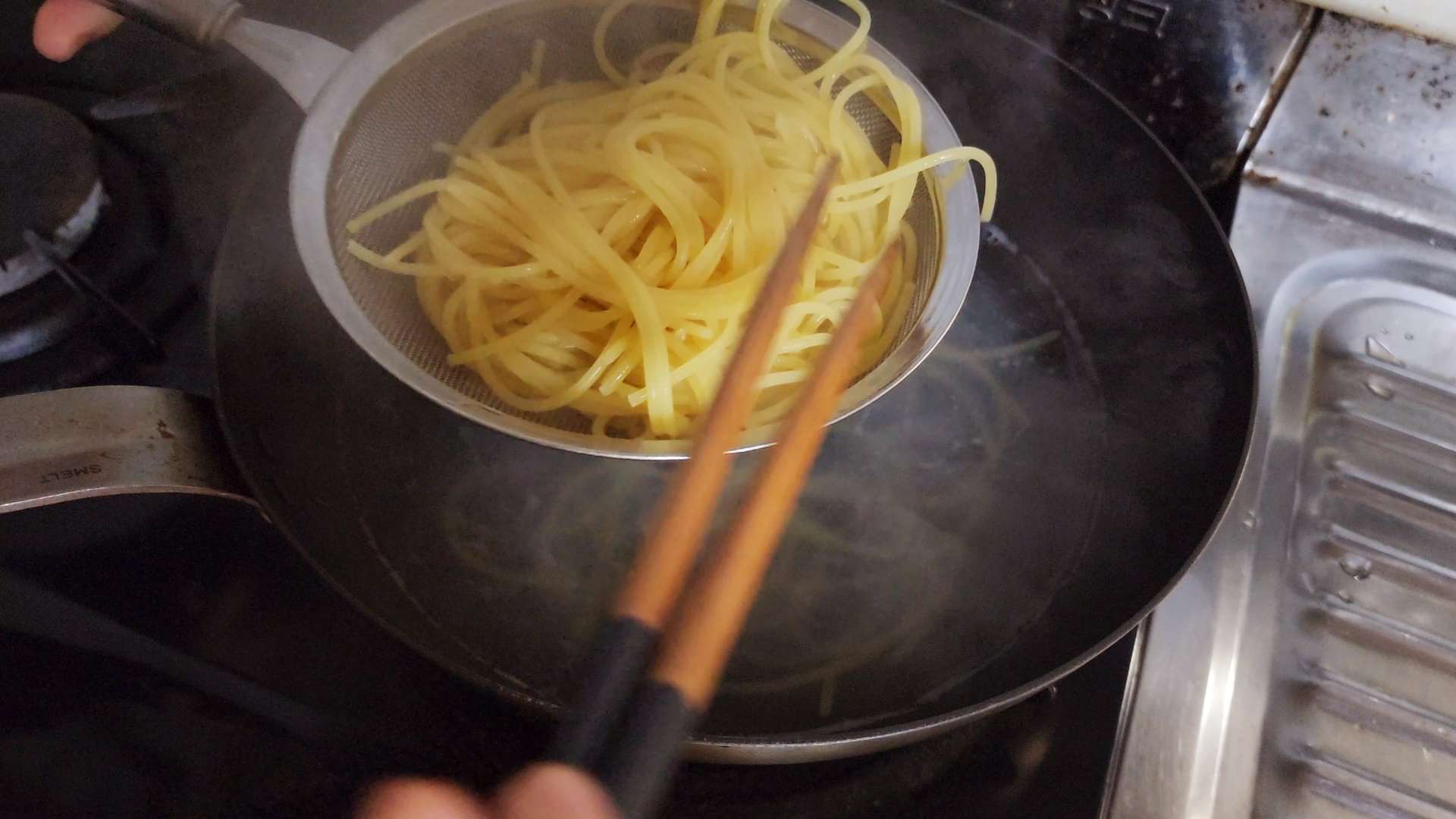 삶은 면을 건지고 면수 5T를 남겨줍니다.