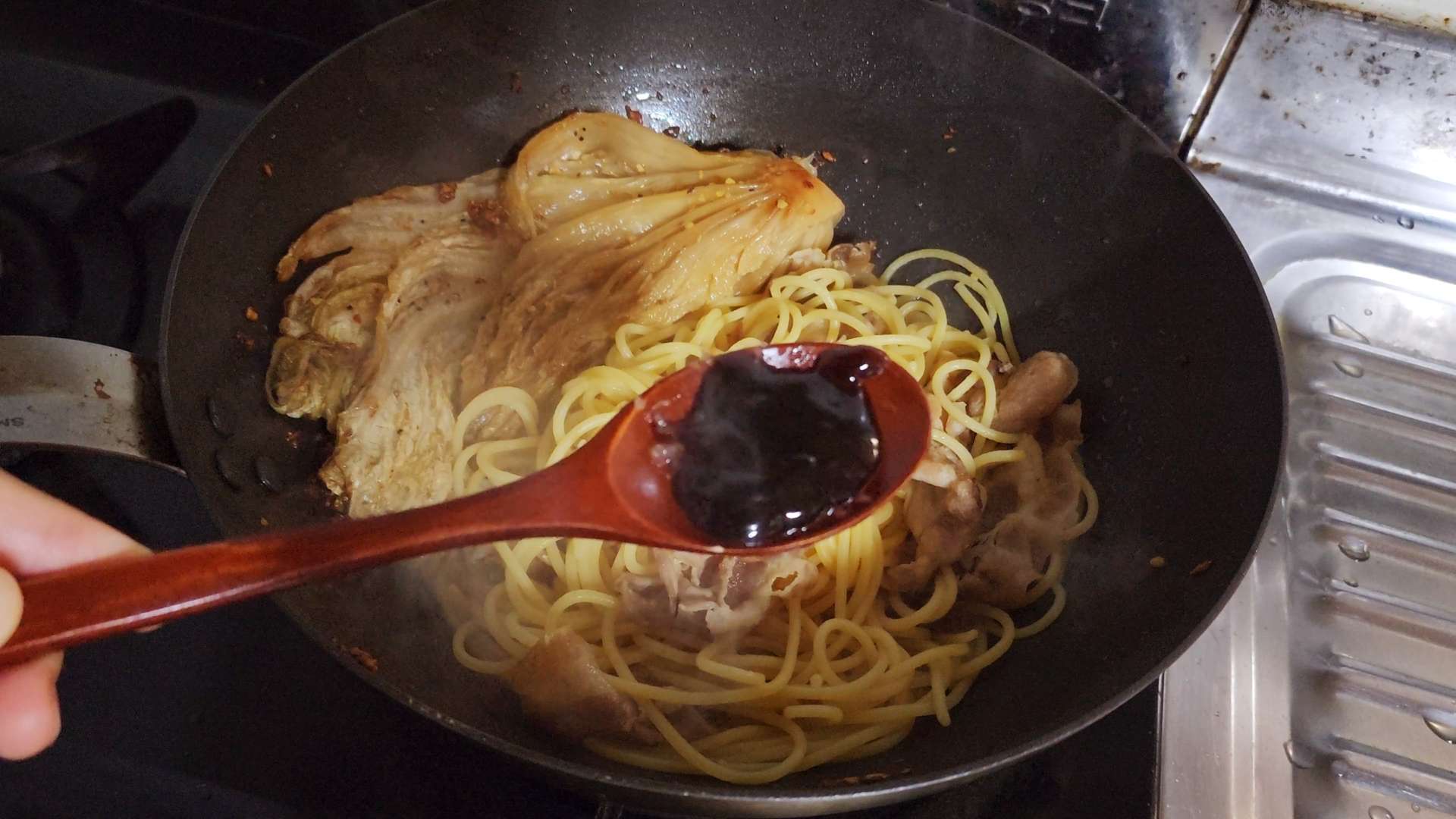 재료: 묵은지 2컵, 대패삼겹살 150g, 파스타면 1인분, 다진 마늘 1/2T, 허브솔트 1T, 소금 한꼬집, 면수 5T, 굴소스 1T,