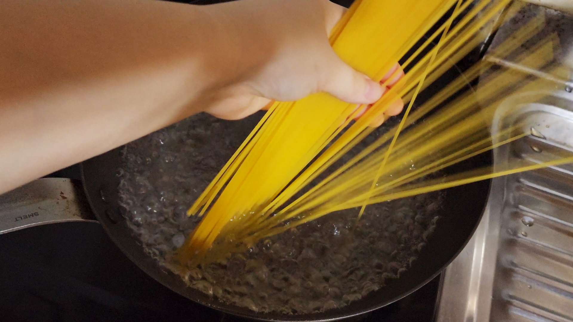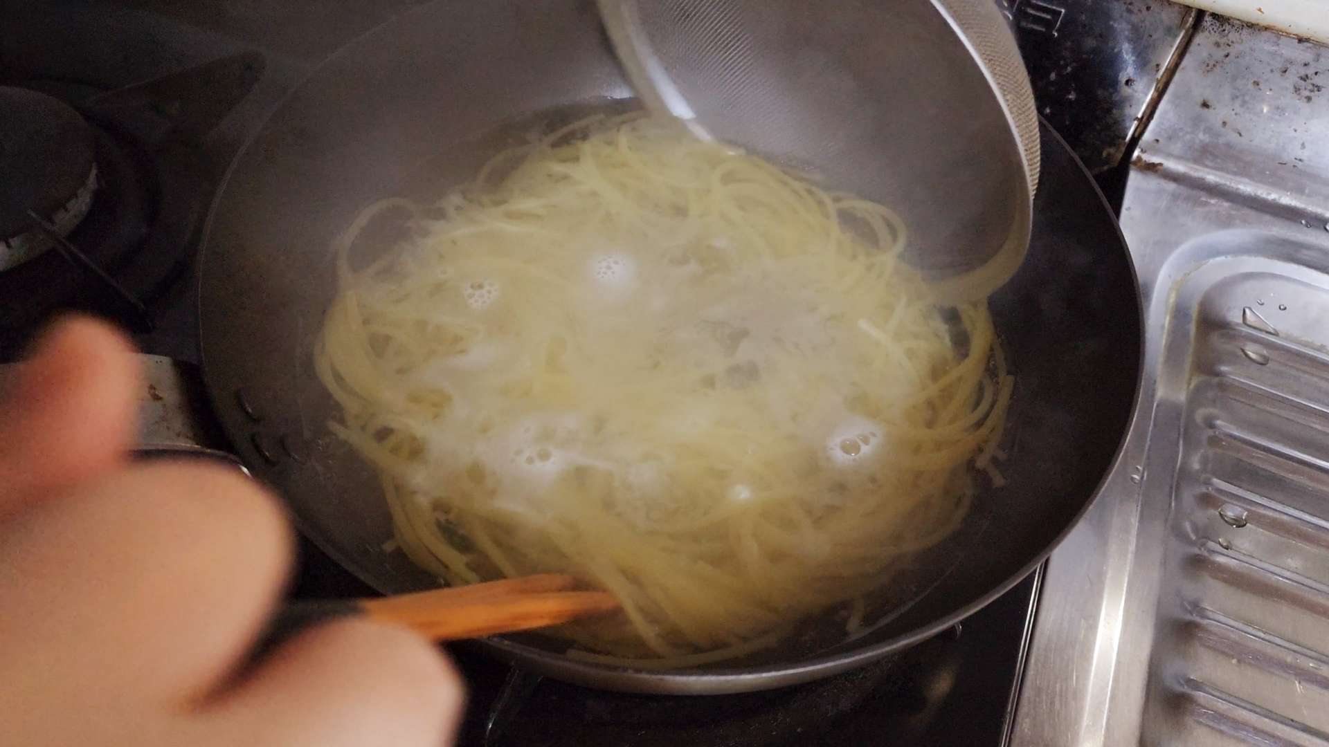끓는 물에 소금 한꼬집을 넣고 파스타 면 1인분을 넣어 9분간 삶아줍니다.