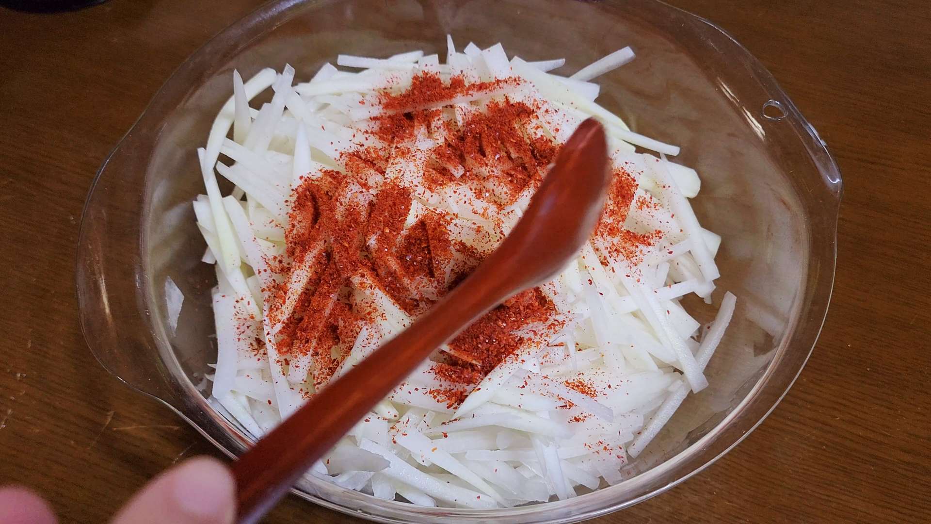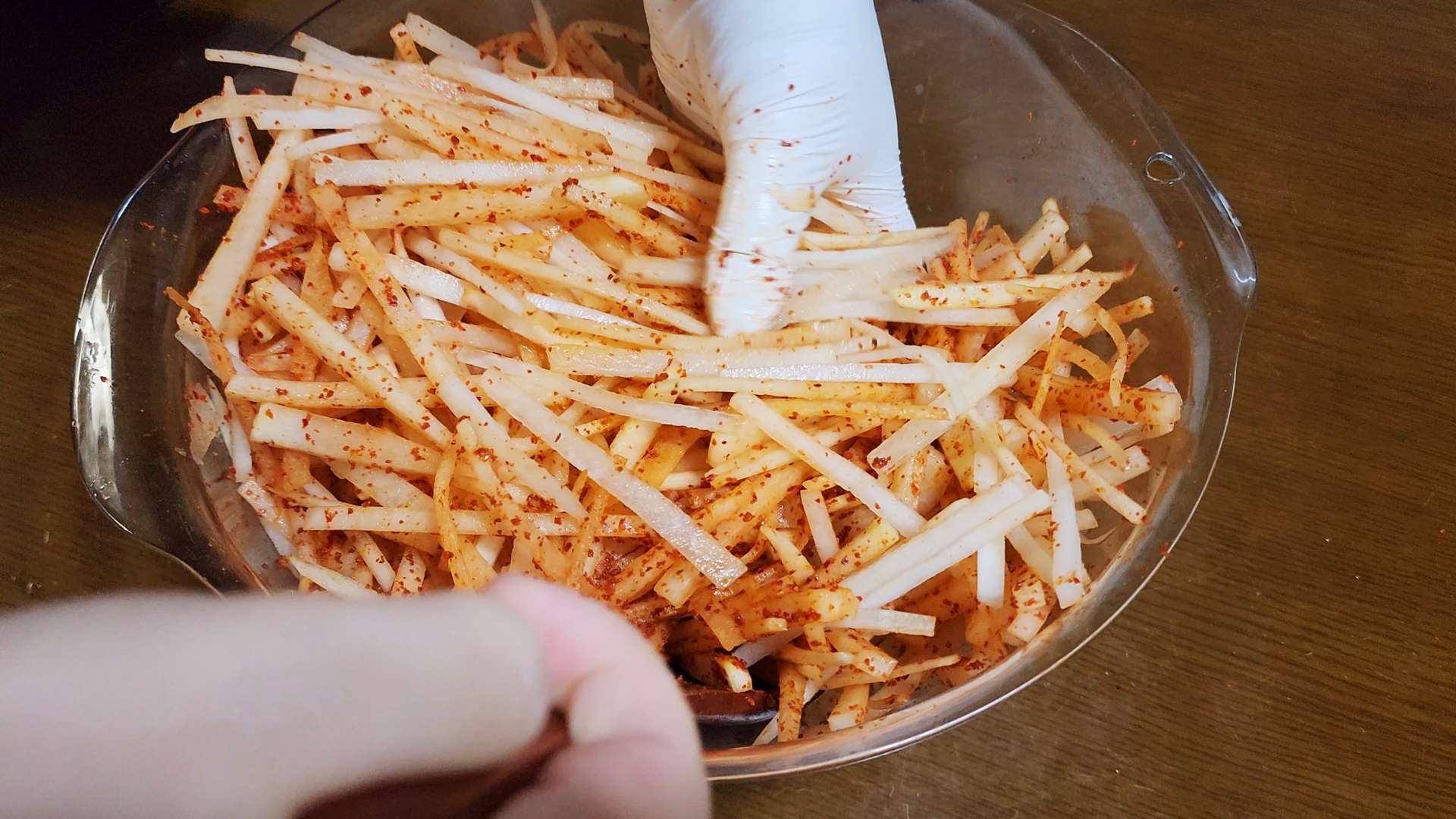 달큰한 무생채를 넣고 밥을 비벼 먹어도 맛있어요.