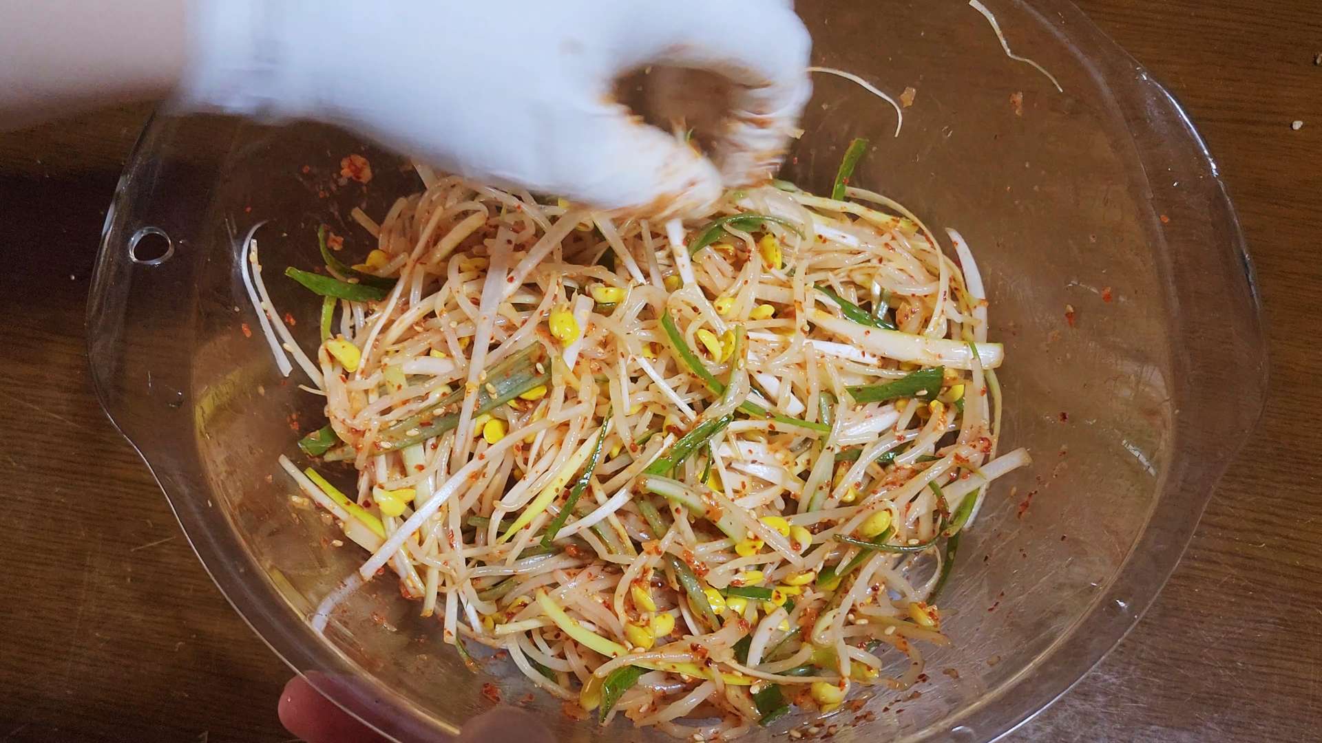 양념: 소금 0.2T, 고춧가루 0.5T, 다진마늘 0.5T, 참기름 1T, 통깨 조금