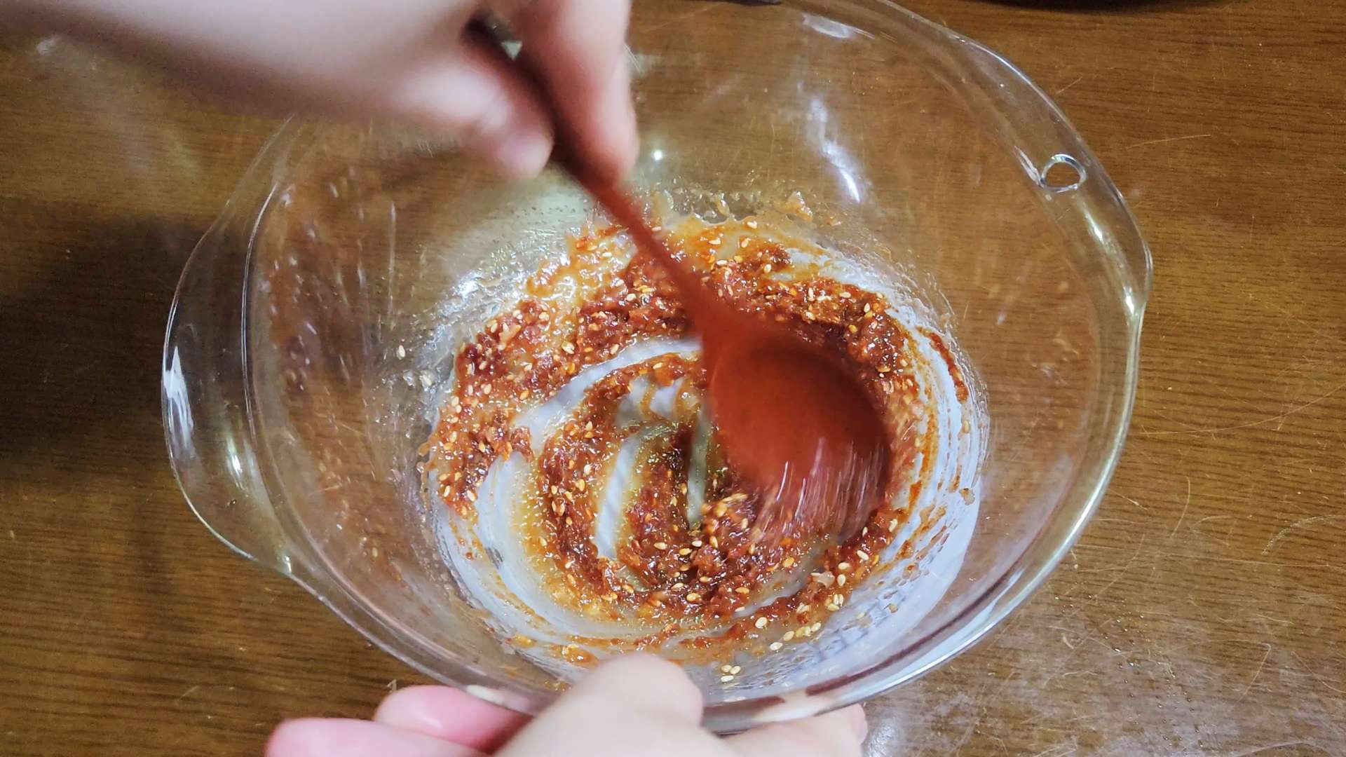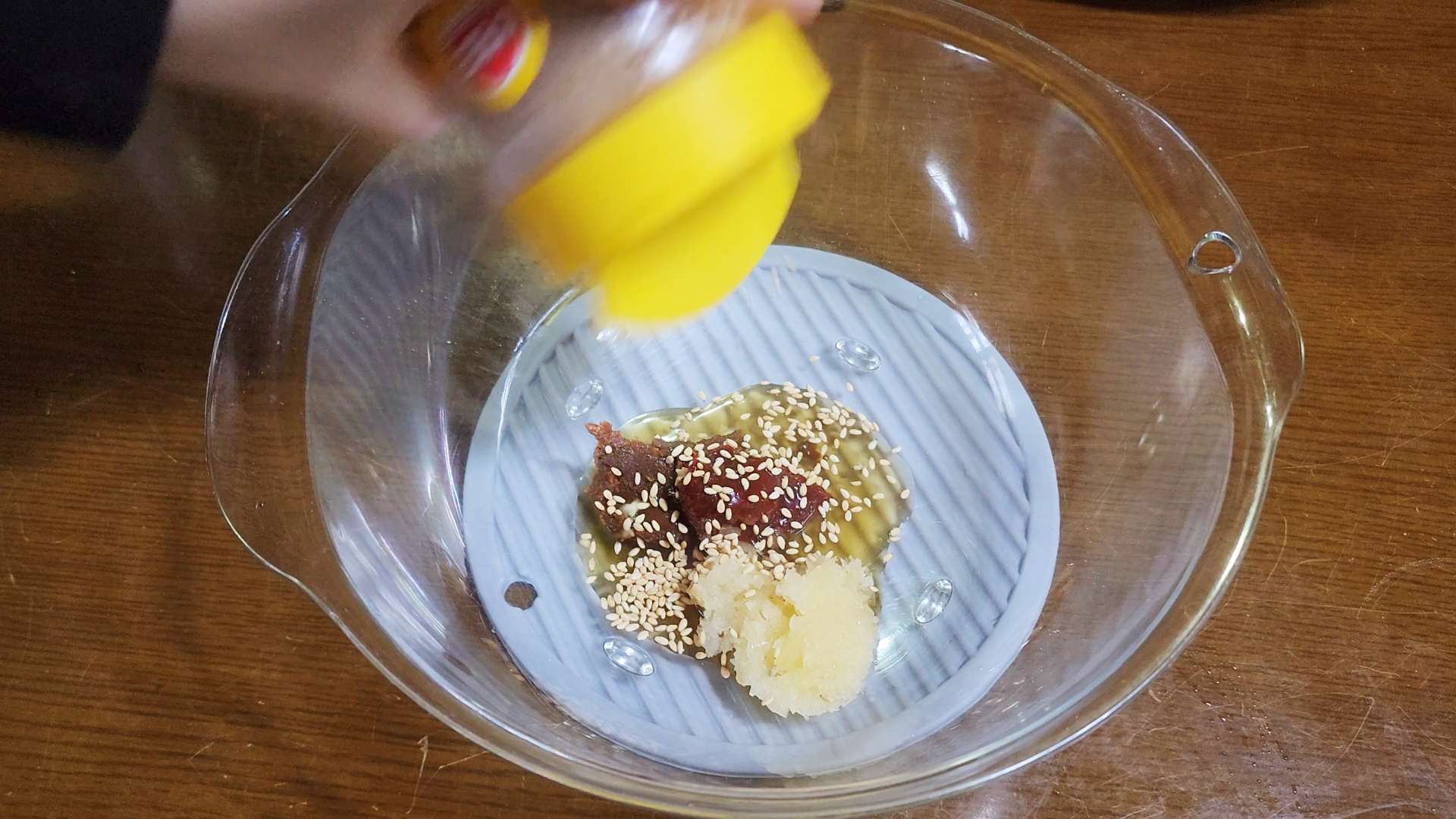 양념: 된장 0.5T, 고추장 0.2T, 매실액 0.5T, 다진마늘 0.5T, 참기름 0.5T, 통깨