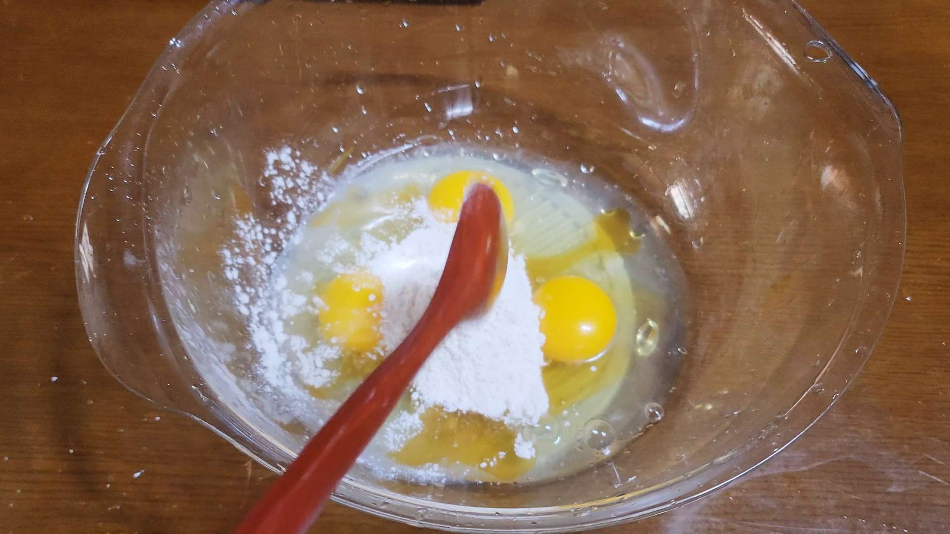 달걀 3개, 참기름 1T, 튀김가루 3T를 섞어줍니다.