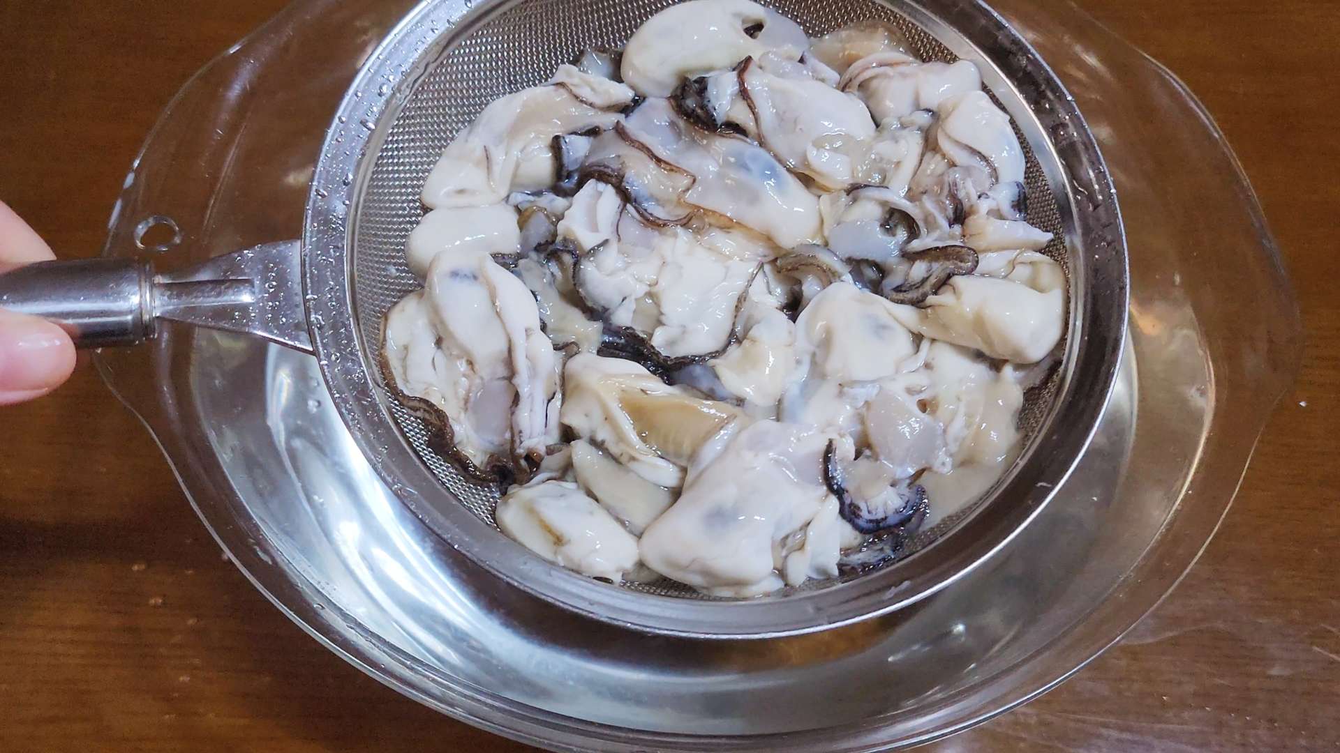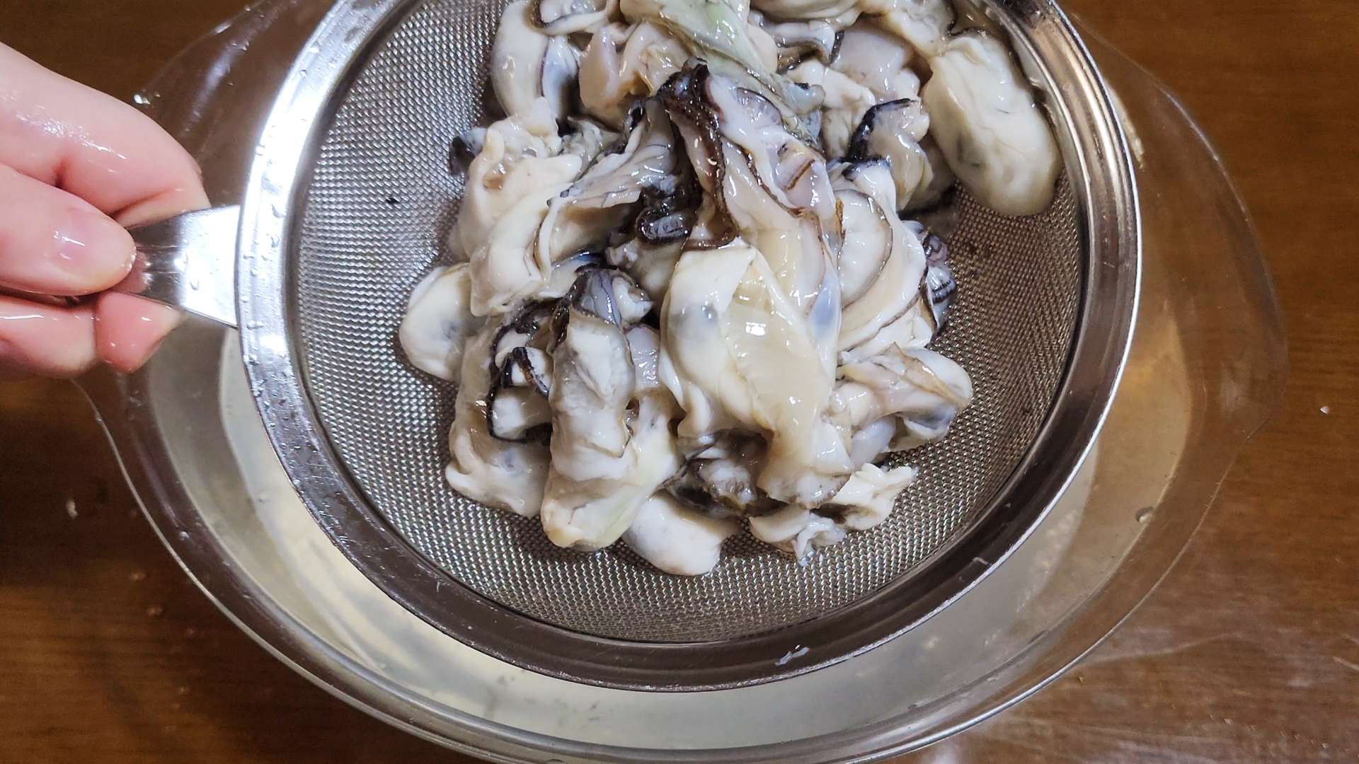 굴 300g을 넣고 살살 흔들어 씻고 체에 밭쳐 물기를 제거해줍니다.
