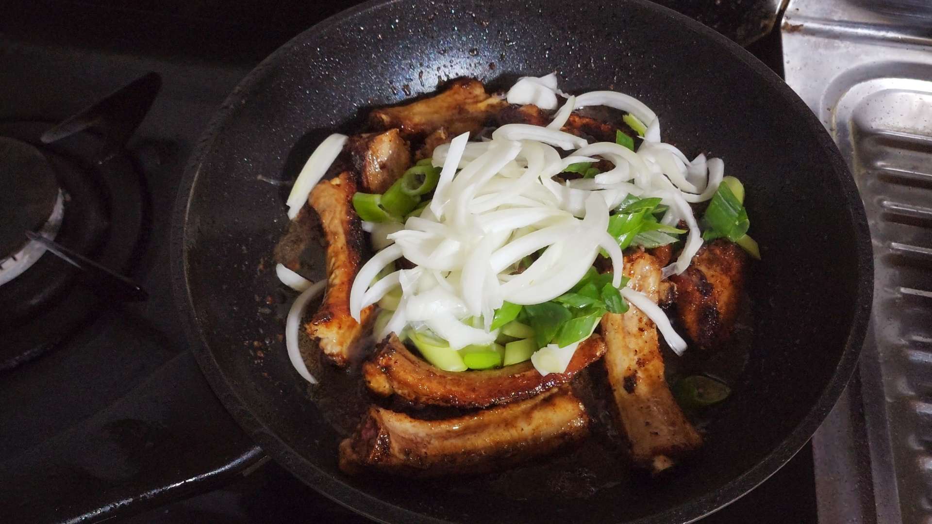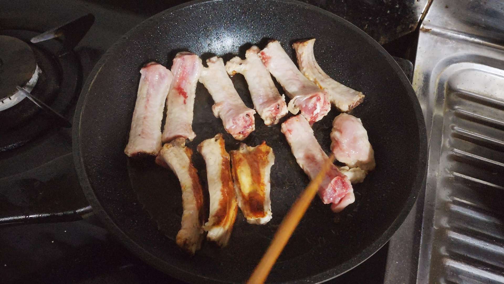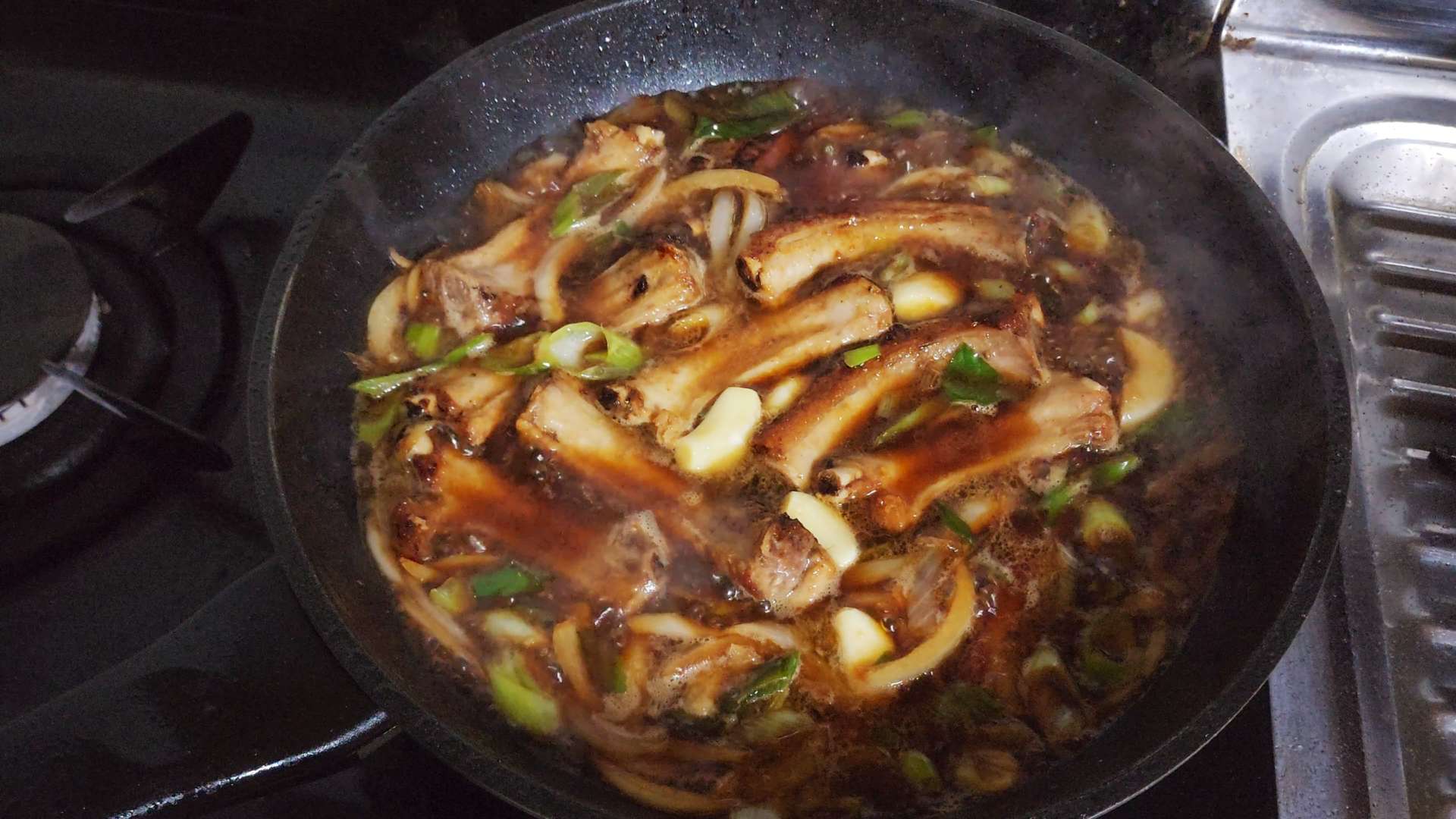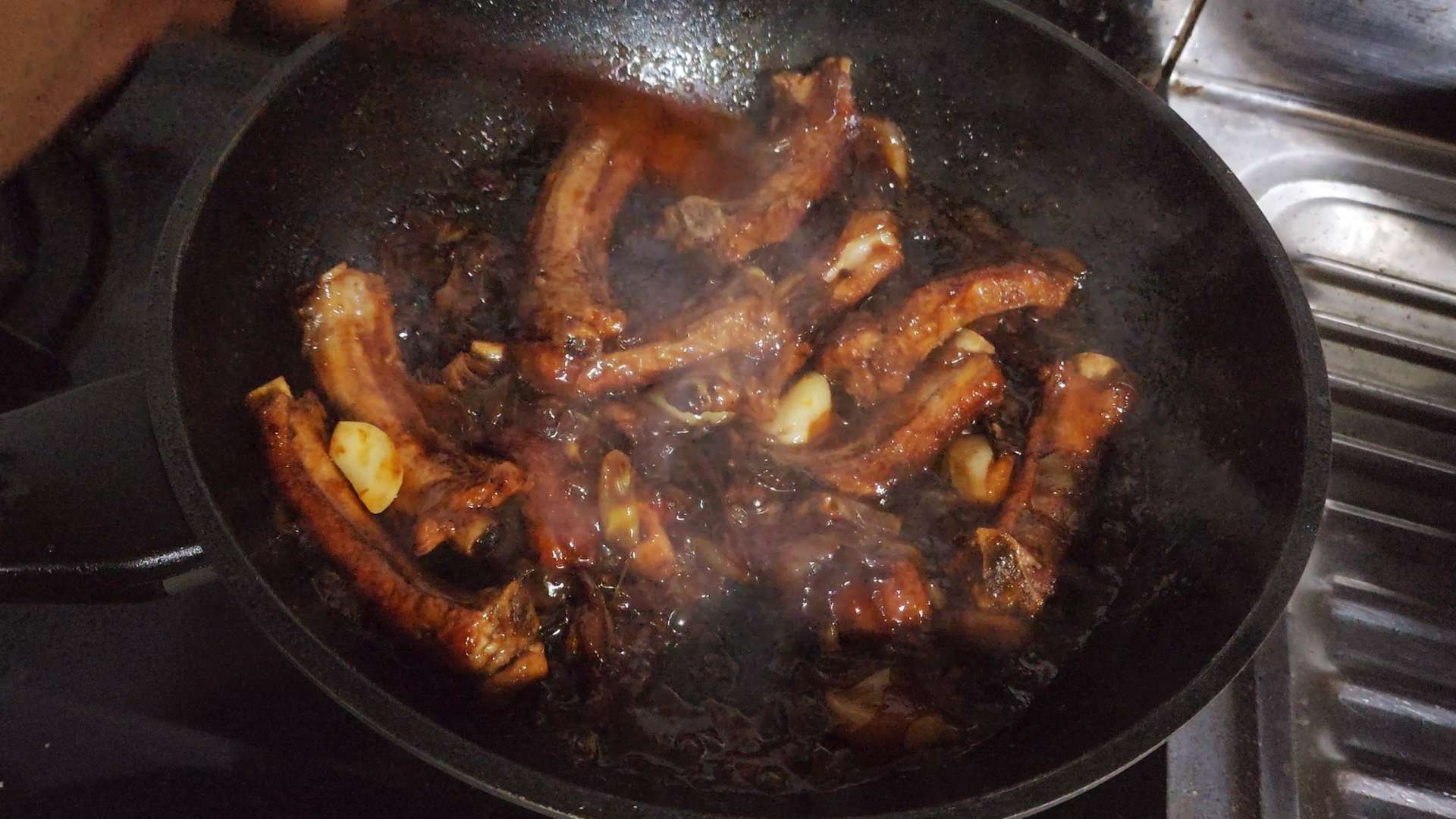 등갈비를 뒤집고 중불로 줄이고 양념을 넣고 3분 정도 태우듯이 볶아줍니다.